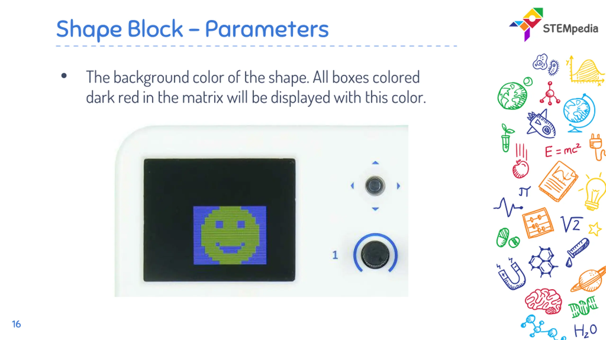Shape Block - Parameters The background color of the shape. All boxes colored dark red in the matrix will be displayed with this color. 16