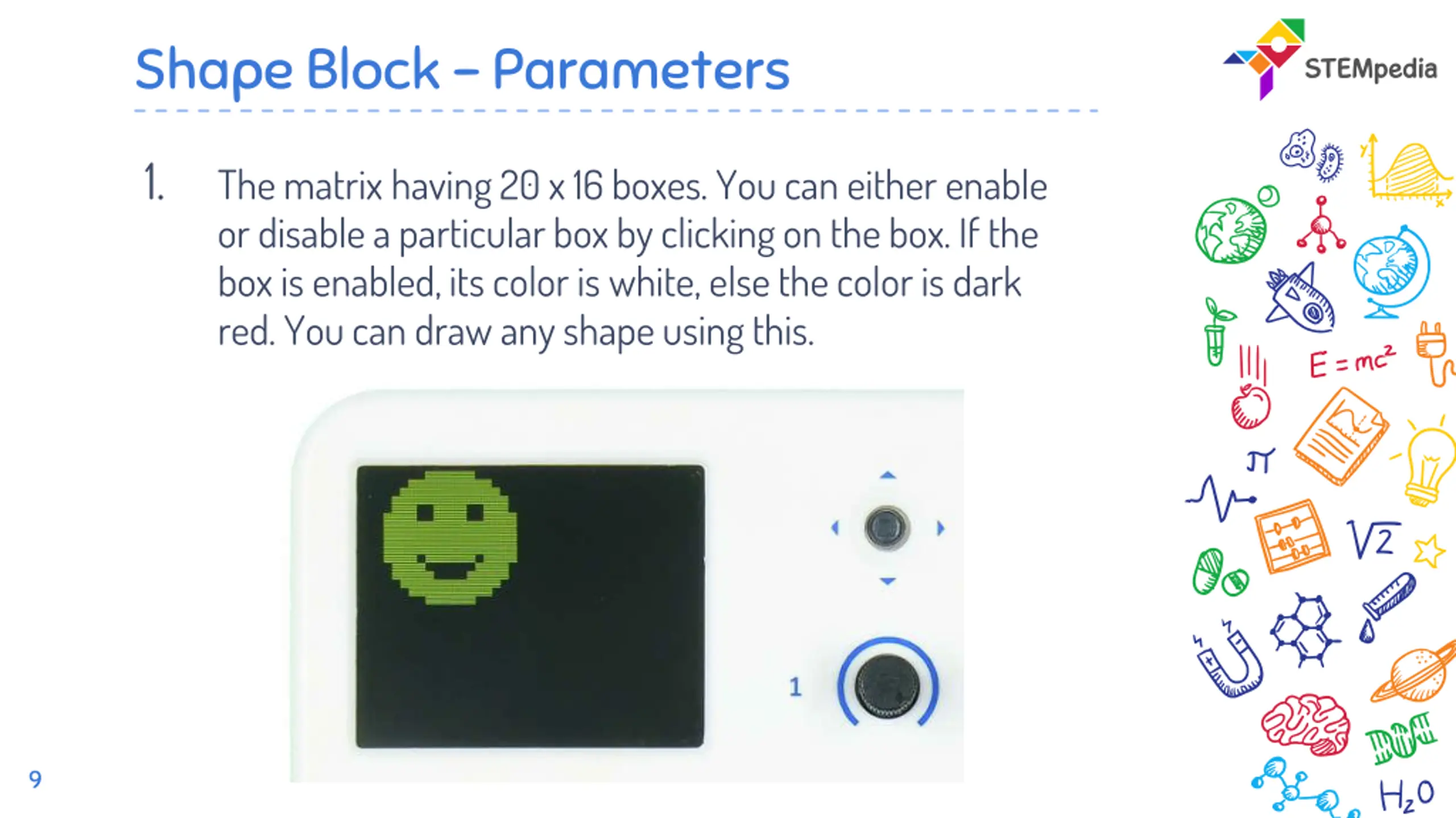 Shape Block - Parameters 1. The matrix having 20 x 16 boxes. You can either enable or disable a particular box by clicking on the box. If the box is enabled, its color is white, else the color is dark red. You can draw any shape using this. 9