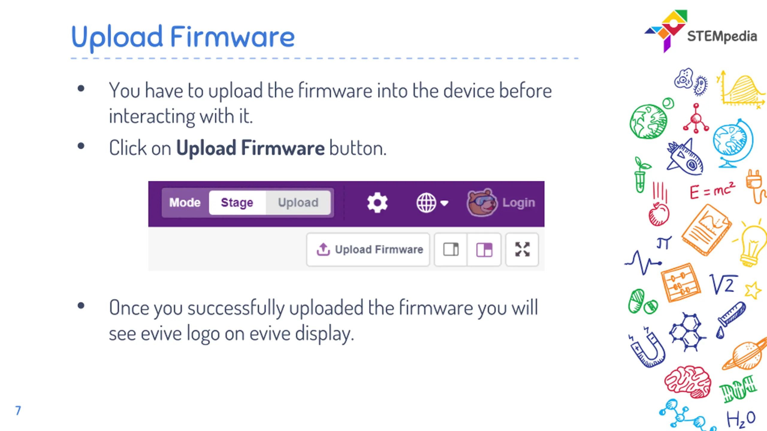 Upload Firmware You have to upload the firmware into the device before interacting with it. Click on Upload Firmware button. Once you successfully uploaded the firmware you will see evive logo on evive display. 7