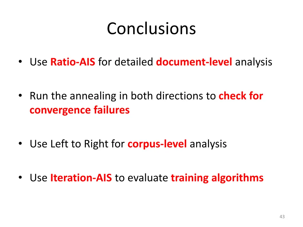 Conclusions Use Ratio-AIS for detailed document-level analysis Run the annealing in both directions to check for convergence failures Use Left to Right for corpus-level analysis Use Iteration-AIS to evaluate training algorithms 43