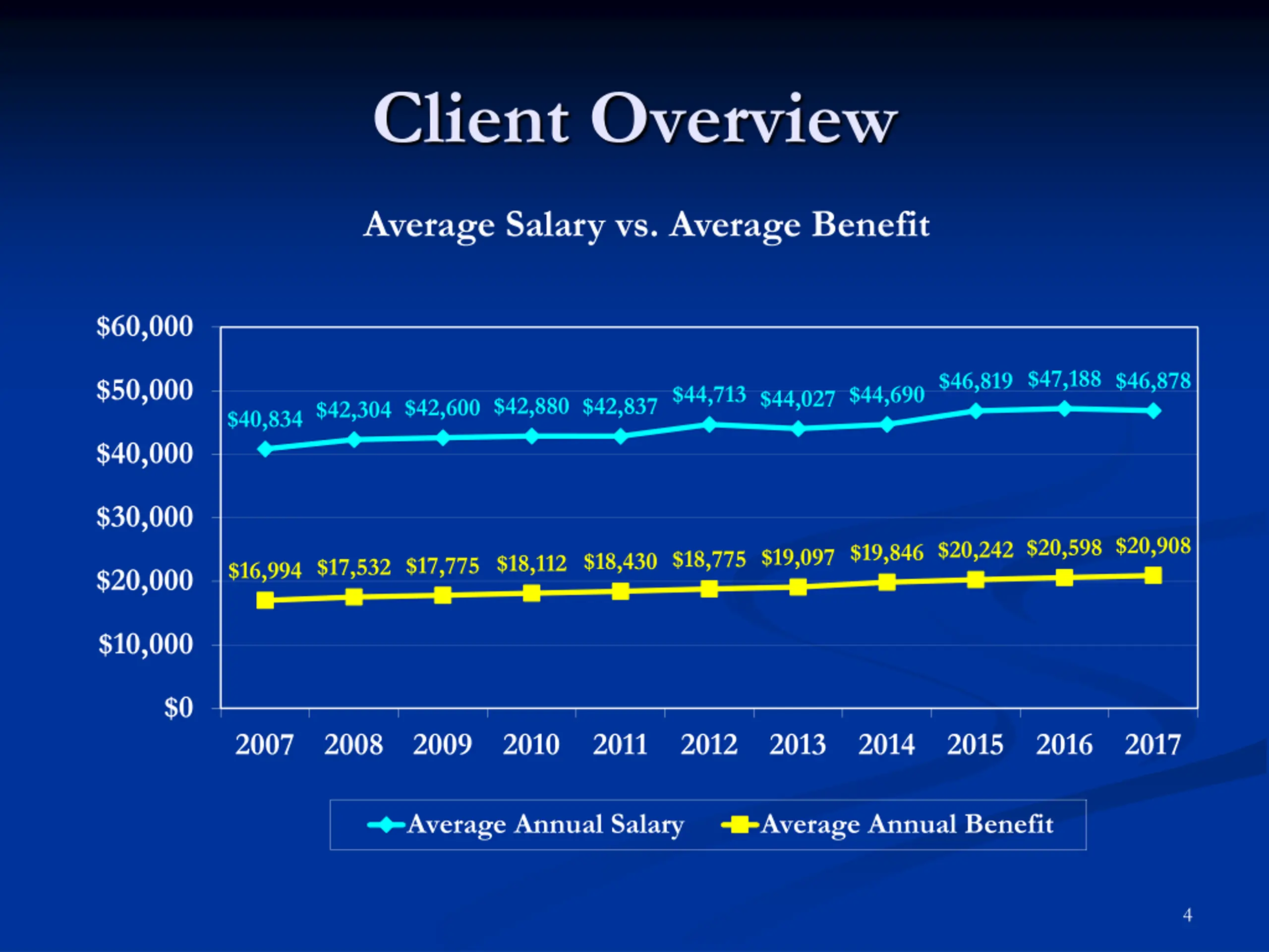 Client Overview Average Salary vs. Average Benefit $60,000 $40,834$42,304 $42,600 $42,880 $42,837$44,713 $44,027 $44,690$46,819 $47,188 $46,878 $50,000 $40,000 $30,000 $16,994 $17,532 $17,775 $18,112 $18,430 $18,775 $19,097 $19,846 $20,242 $20,598 $20,908 $20,000 $10,000 $0 2007 2008 2009 2010 2011 2012 2013 2014 2015 2016 2017 Average Annual Salary Average Annual Benefit 4