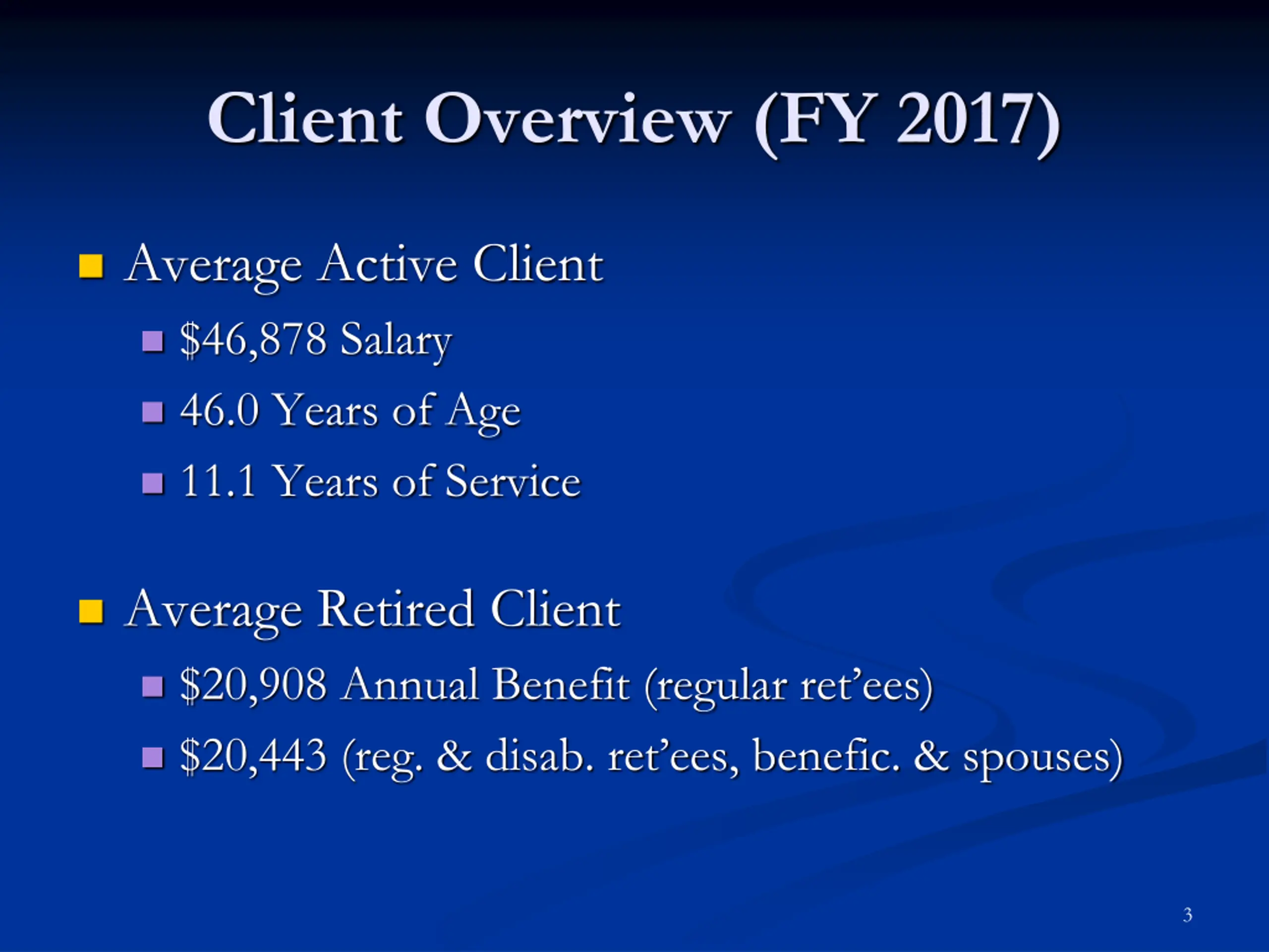 Client Overview (FY 2017) Average Active Client $46,878 Salary 46.0 Years of Age 11.1 Years of Service Average Retired Client $20,908 Annual Benefit (regular ret ees) $20,443 (reg. & disab. ret ees, benefic. & spouses) 3
