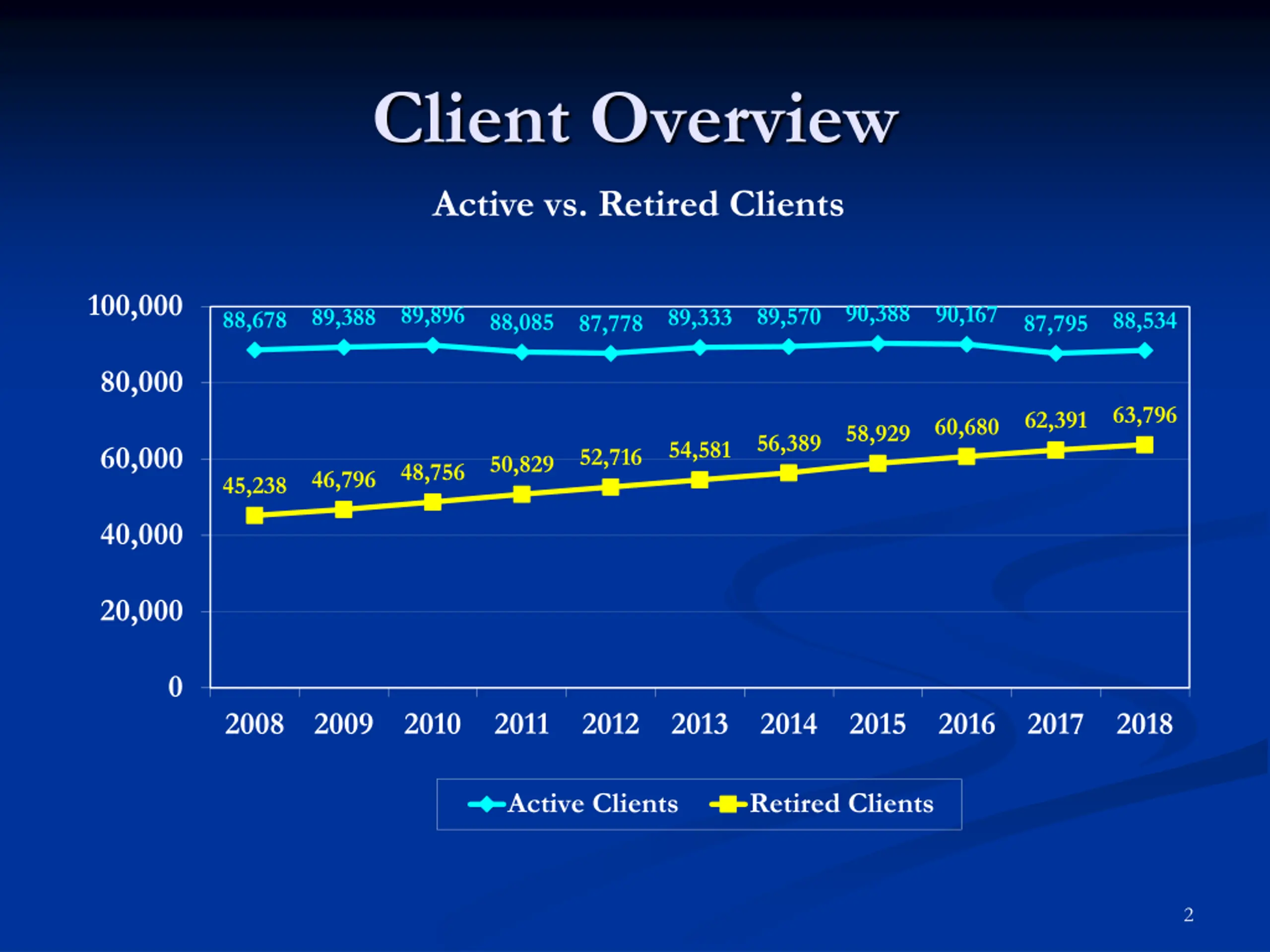 Client Overview Active vs. Retired Clients 100,000 90,388 90,167 89,896 89,570 89,388 89,333 88,678 88,534 88,085 87,795 87,778 80,000 63,796 62,391 60,680 58,929 56,389 54,581 60,000 52,716 50,829 48,756 46,796 45,238 40,000 20,000 0 2008 2009 2010 2011 2012 2013 2014 2015 2016 2017 2018 Active Clients Retired Clients 2