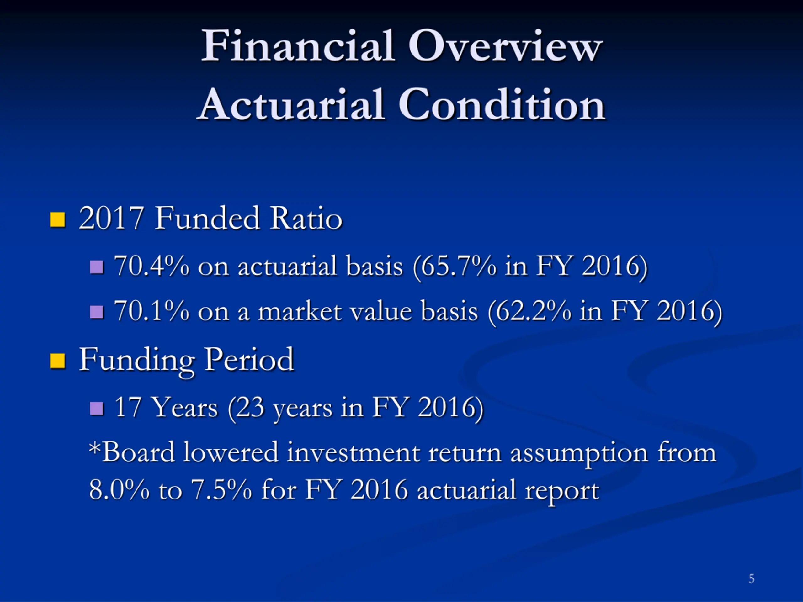 Financial Overview Actuarial Condition 2017 Funded Ratio 70.4% on actuarial basis (65.7% in FY 2016) 70.1% on a market value basis (62.2% in FY 2016) Funding Period 17 Years (23 years in FY 2016) *Board lowered investment return assumption from 8.0% to 7.5% for FY 2016 actuarial report 5