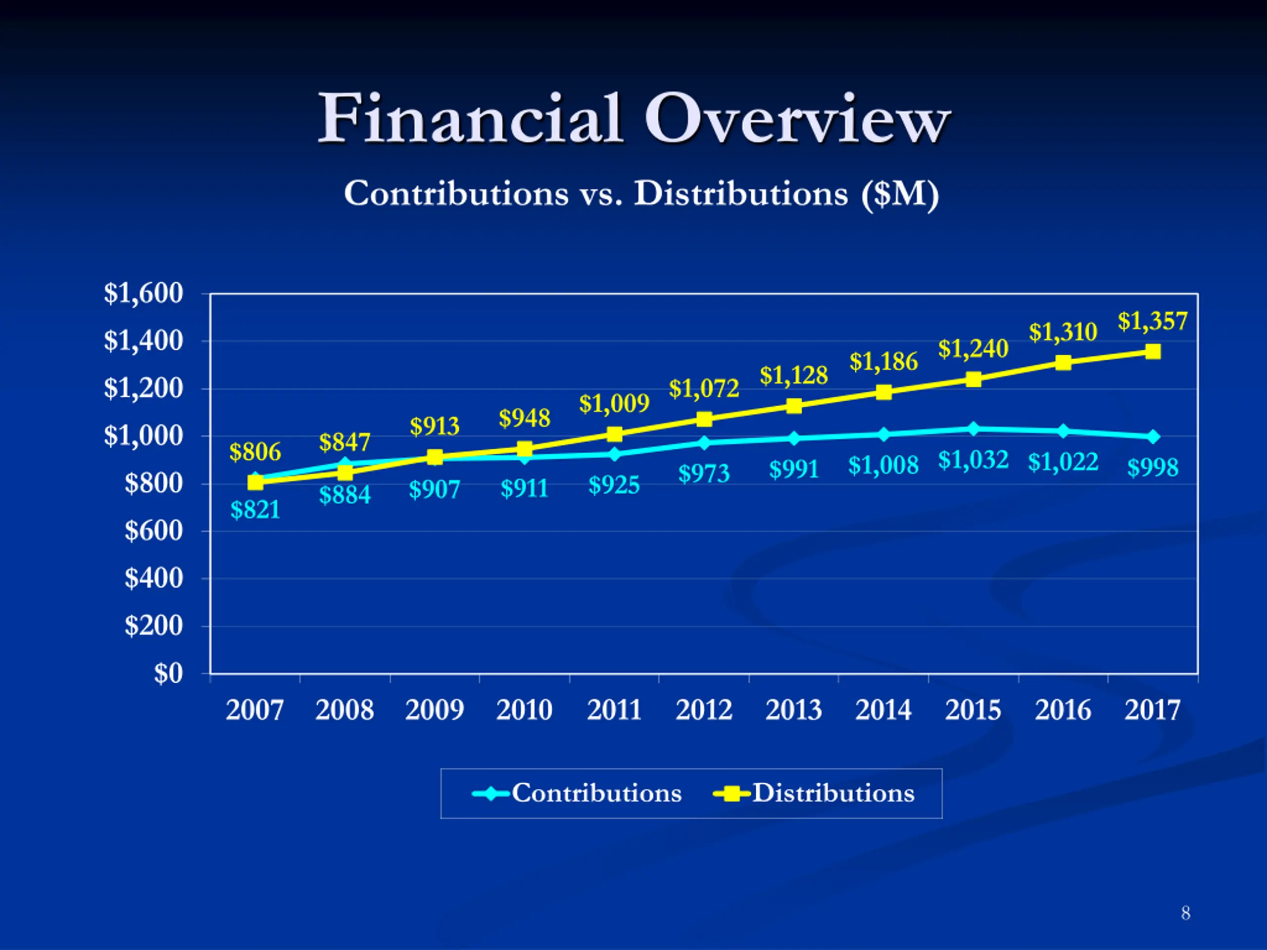 Financial Overview Assets vs. Liabilities $25,000 80% 70% $20,000 60% 50% $15,000 40% $10,000 30% 20% $5,000 10% $0 0% 1998 1999 2000 2001 2002 2003 2004 2005 2006 2007 2008 2009 2010 2011 2012 2013 2014 2015 2016 2017 Assets (Left) Liabilities (Left) Funded Ratio (Right) 6