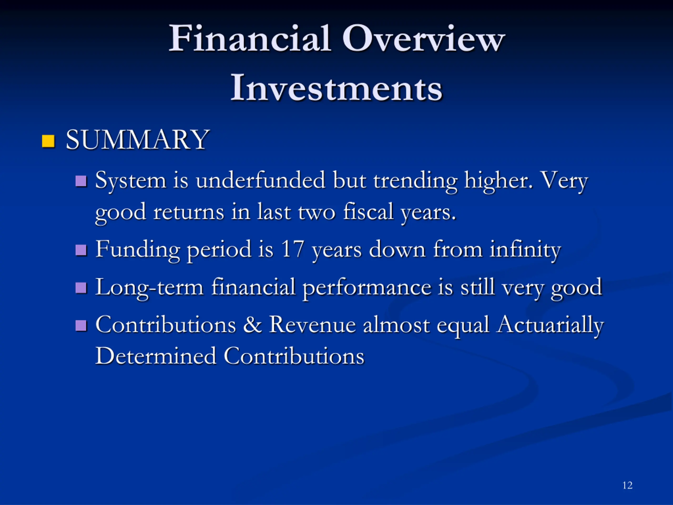 Financial Overview Investments SUMMARY System is underfunded but trending higher. Very good returns in last two fiscal years. Funding period is 17 years down from infinity Long-term financial performance is still very good Contributions & Revenue almost equal Actuarially Determined Contributions 12