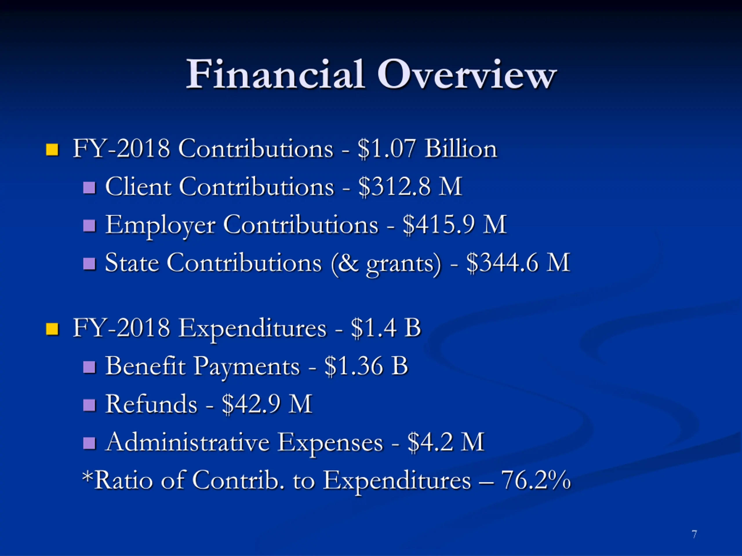 Financial Overview FY-2018 Contributions - $1.07 Billion Client Contributions - $312.8 M Employer Contributions - $415.9 M State Contributions (& grants) - $344.6 M FY-2018 Expenditures - $1.4 B Benefit Payments - $1.36 B Refunds - $42.9 M Administrative Expenses - $4.2 M *Ratio of Contrib. to Expenditures 76.2% 7