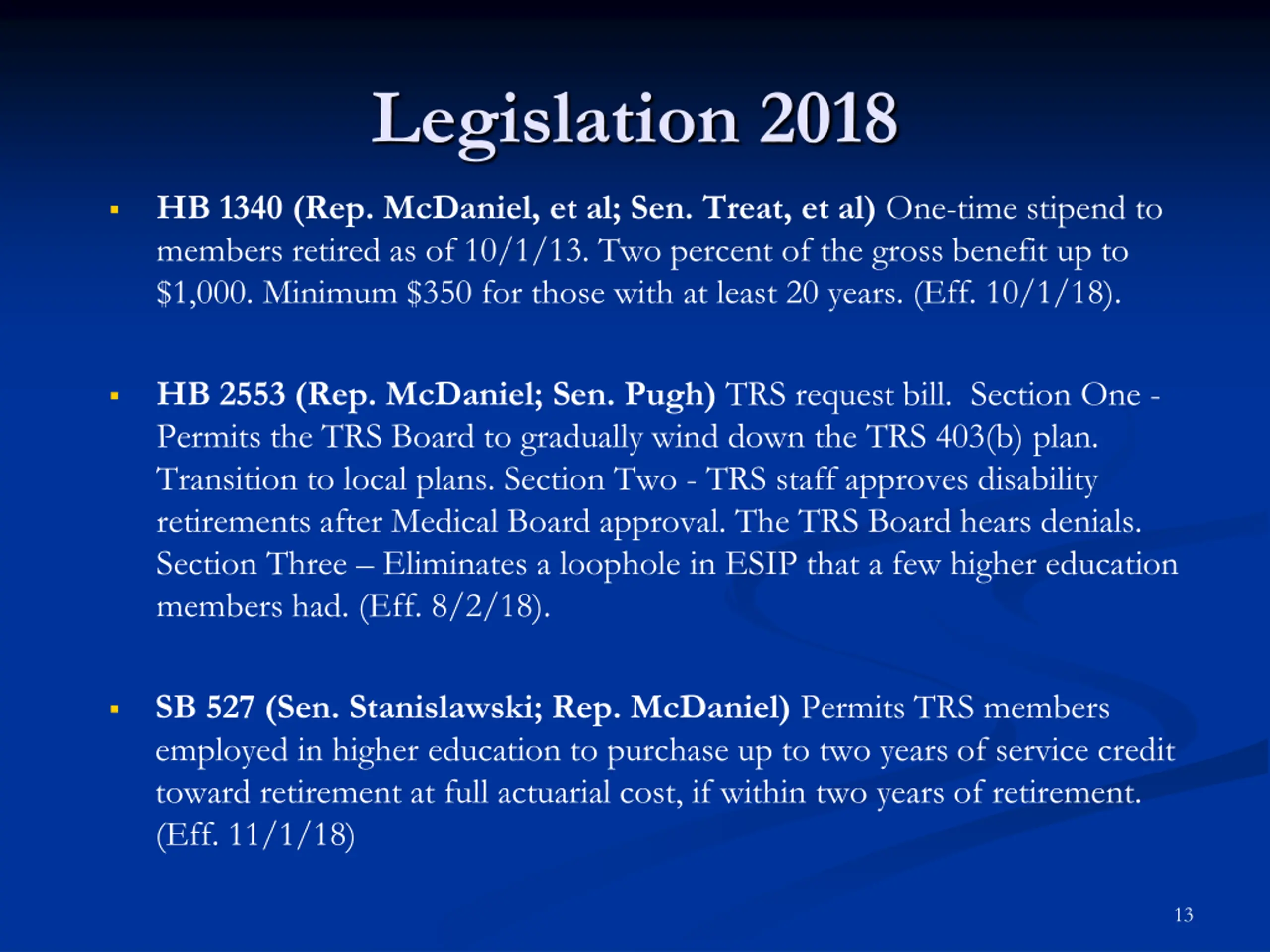Legislation 2018 HB 1340 (Rep. McDaniel, et al; Sen. Treat, et al) One-time stipend to members retired as of 10/1/13. Two percent of the gross benefit up to $1,000. Minimum $350 for those with at least 20 years. (Eff. 10/1/18). HB 2553 (Rep. McDaniel; Sen. Pugh) TRS request bill. Section One - Permits the TRS Board to gradually wind down the TRS 403(b) plan. Transition to local plans. Section Two - TRS staff approves disability retirements after Medical Board approval. The TRS Board hears denials. Section Three Eliminates a loophole in ESIP that a few higher education members had. (Eff. 8/2/18). SB 527 (Sen. Stanislawski; Rep. McDaniel) Permits TRS members employed in higher education to purchase up to two years of service credit toward retirement at full actuarial cost, if within two years of retirement. (Eff. 11/1/18) 13