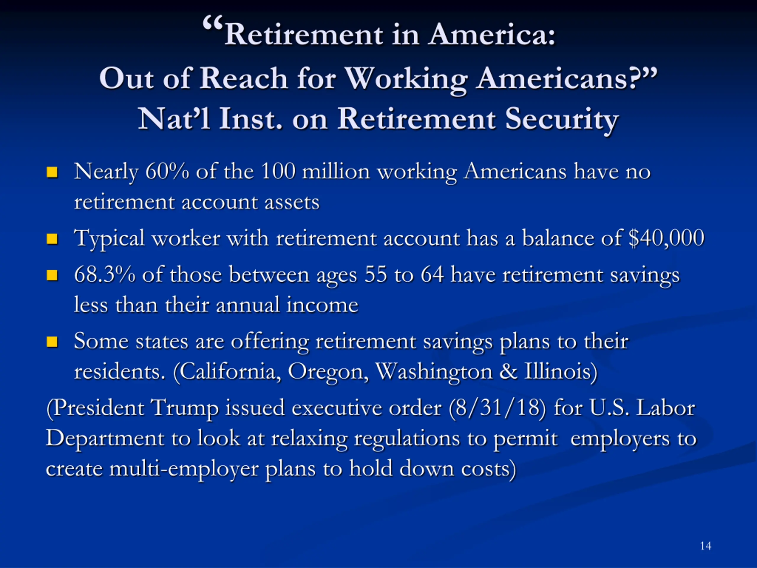 Retirement in America: Out of Reach for Working Americans? Nat l Inst. on Retirement Security Nearly 60% of the 100 million working Americans have no retirement account assets Typical worker with retirement account has a balance of $40,000 68.3% of those between ages 55 to 64 have retirement savings less than their annual income Some states are offering retirement savings plans to their residents. (California, Oregon, Washington & Illinois) (President Trump issued executive order (8/31/18) for U.S. Labor Department to look at relaxing regulations to permit employers to create multi-employer plans to hold down costs) 14