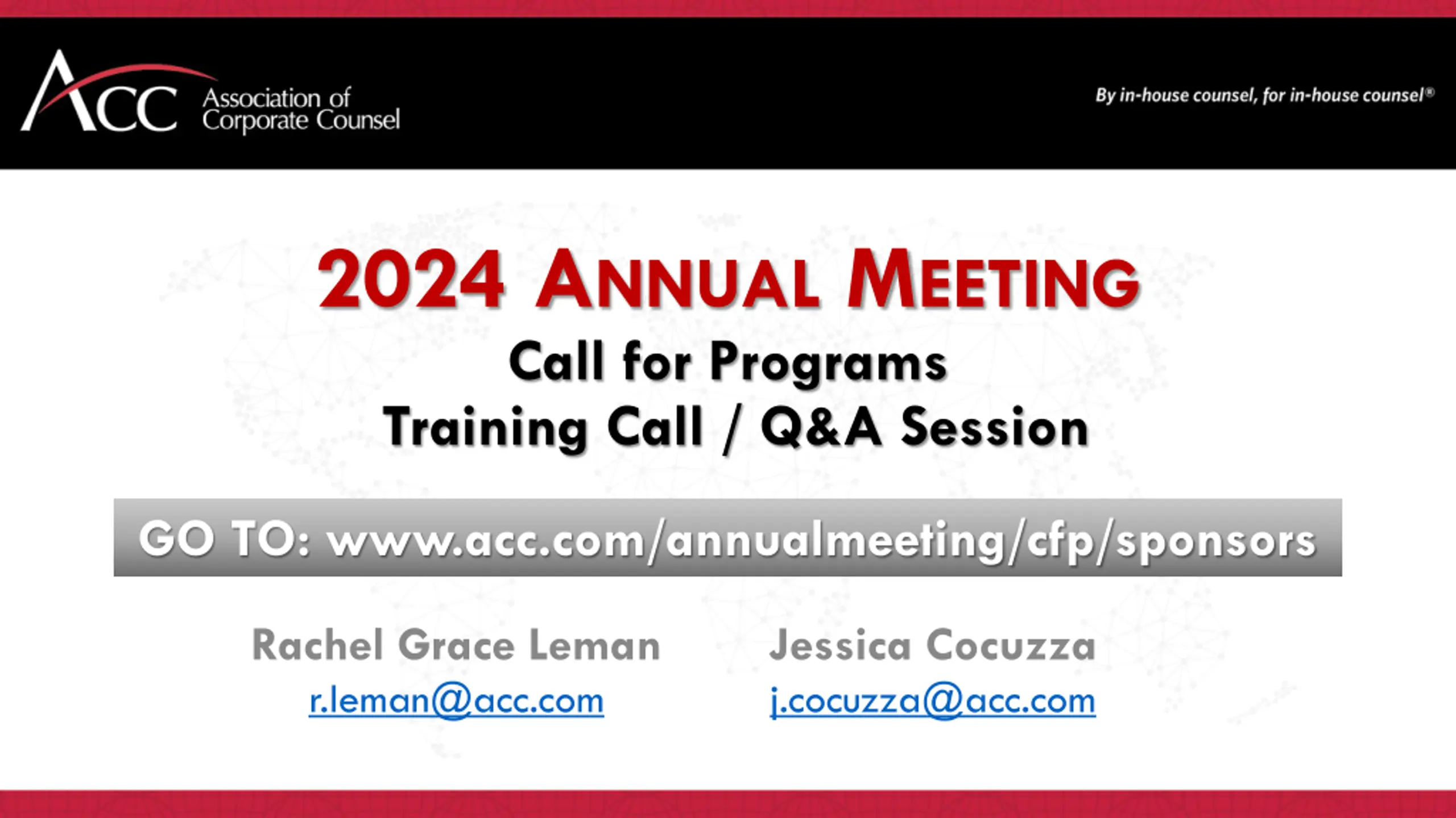 2024 ANNUAL MEETING Call for Programs Training Call / Q&A Session GO TO: www.acc.com/annualmeeting/cfp/sponsors Rachel Grace Leman r.leman@acc.com Jessica Cocuzza j.cocuzza@acc.com