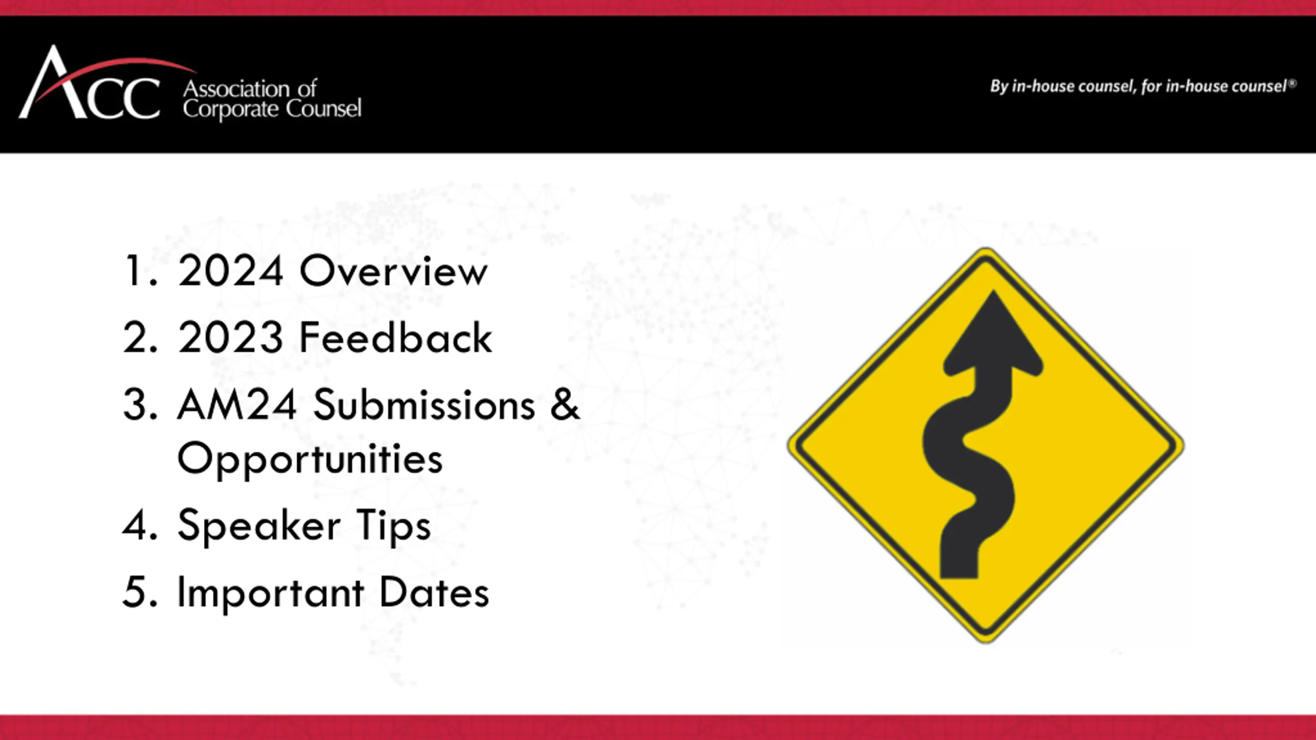 1. 2024 Overview 2. 2023 Feedback 3. AM24 Submissions & Opportunities 4. Speaker Tips 5. Important Dates
