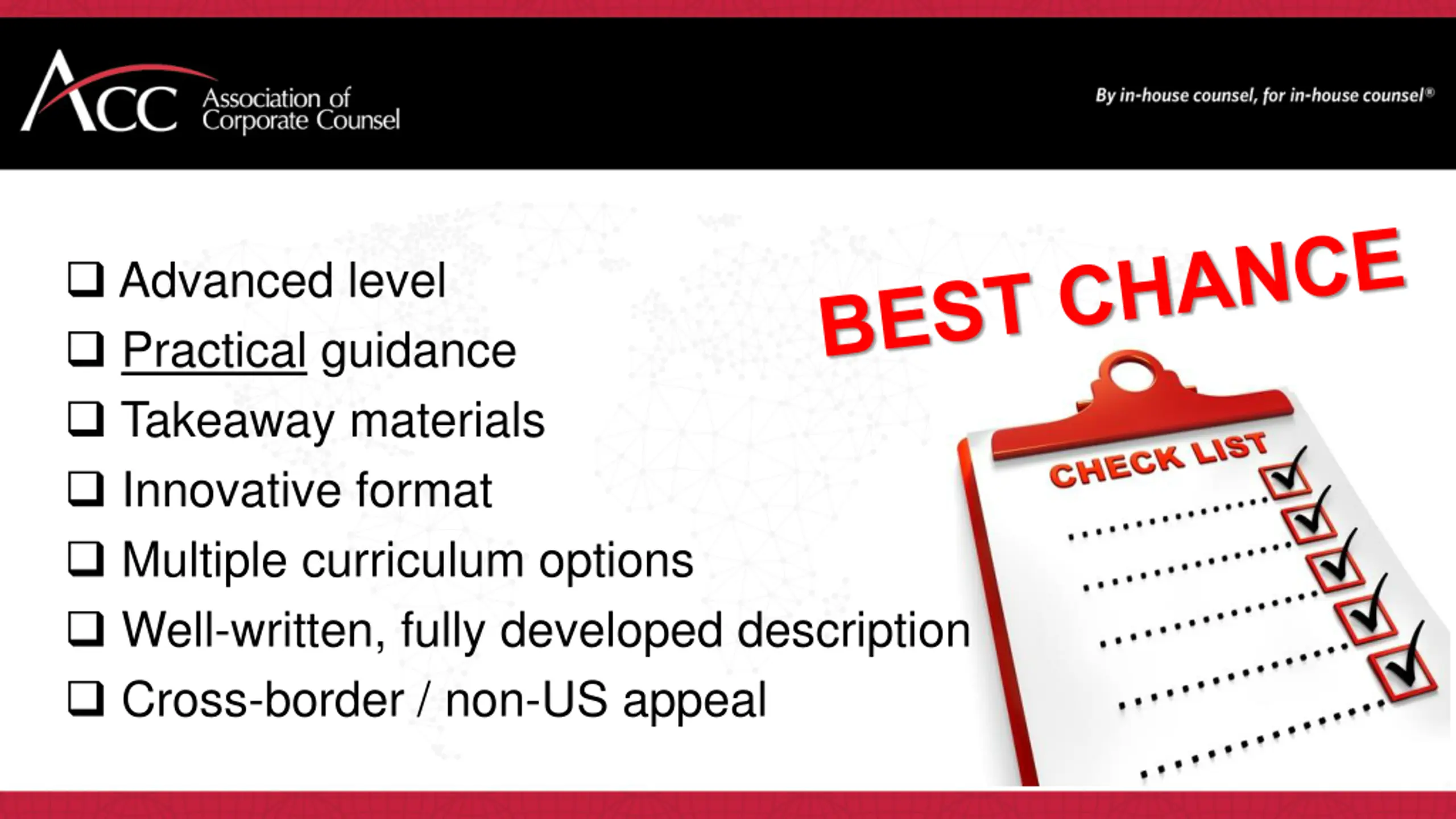 Advanced level Practical guidance Takeaway materials Innovative format Multiple curriculum options Well-written, fully developed description Cross-border / non-US appeal