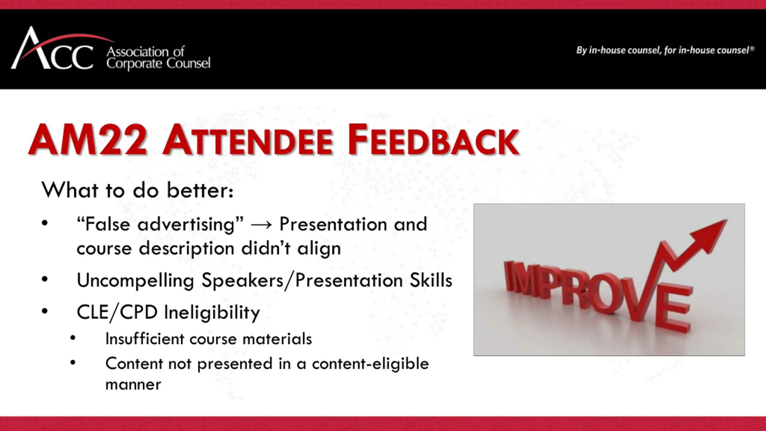 AM22 ATTENDEE FEEDBACK What to do better: False advertising Presentation and course description didn t align Uncompelling Speakers/Presentation Skills CLE/CPD Ineligibility Insufficient course materials Content not presented in a content-eligible manner