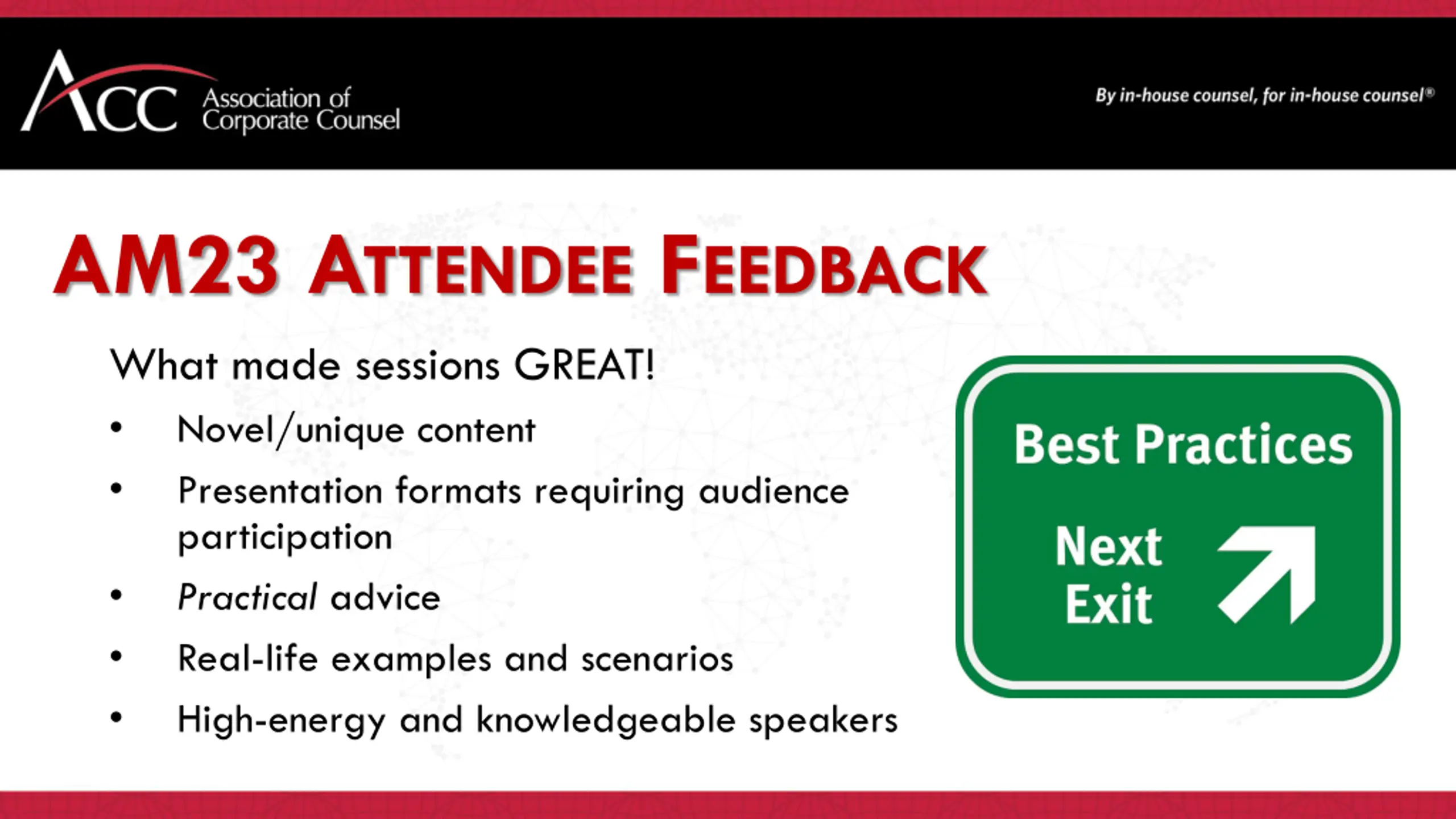AM23 ATTENDEE FEEDBACK What made sessions GREAT! Novel/unique content Presentation formats requiring audience participation Practical advice Real-life examples and scenarios High-energy and knowledgeable speakers