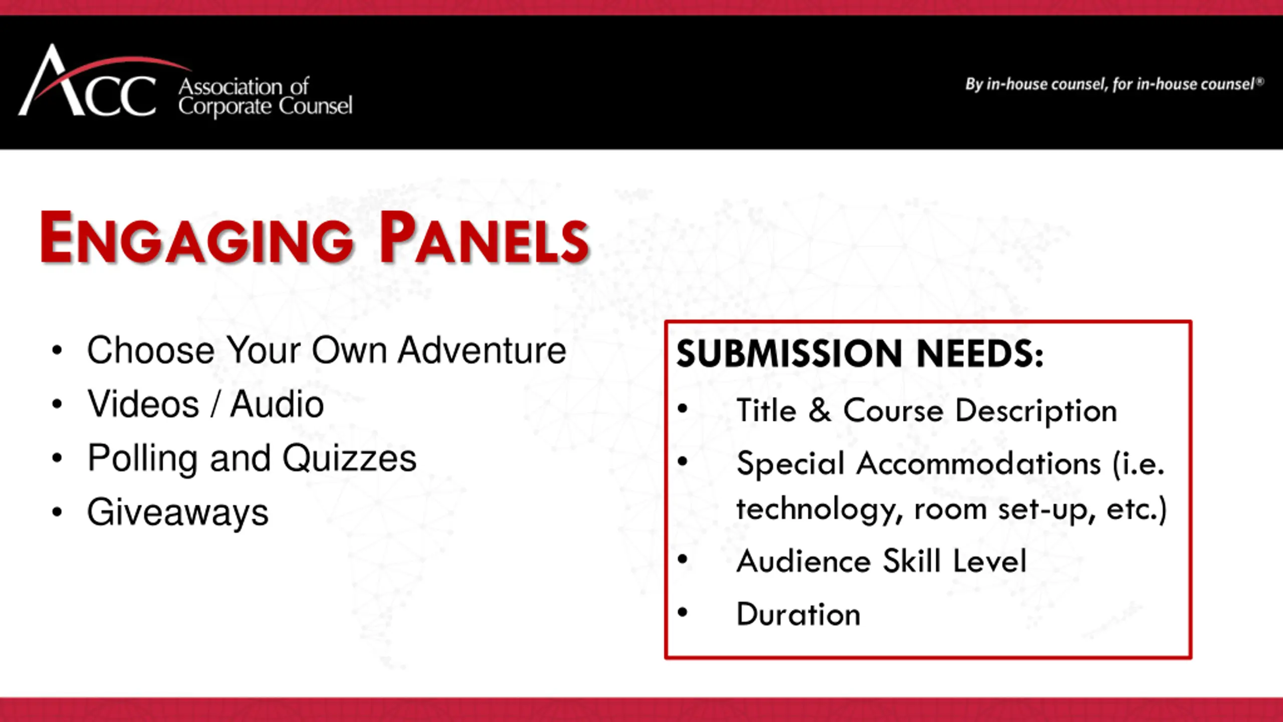 ENGAGING PANELS Choose Your Own Adventure Videos / Audio Polling and Quizzes Giveaways SUBMISSION NEEDS: Title & Course Description Special Accommodations (i.e. technology, room set-up, etc.) Audience Skill Level Duration