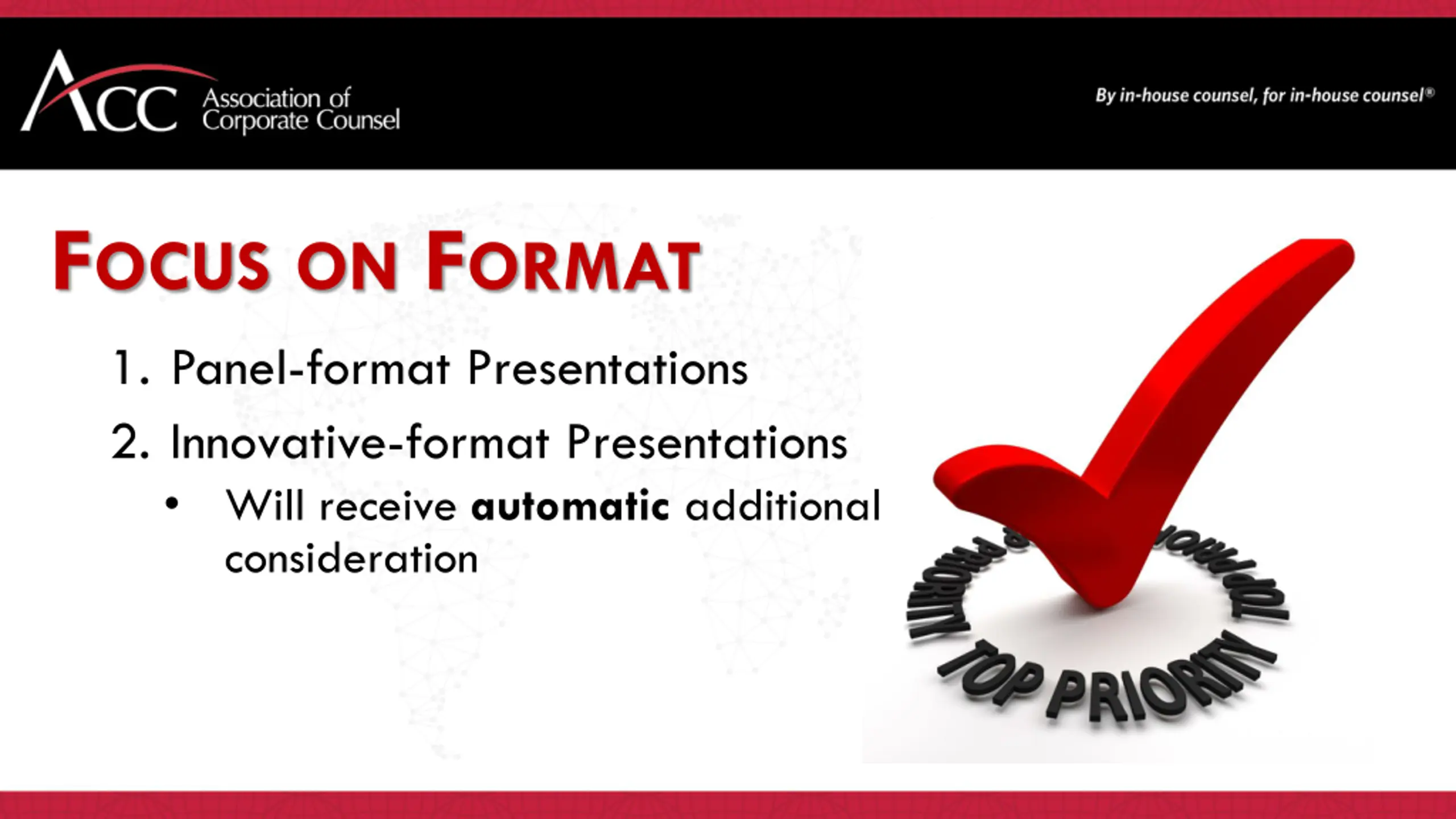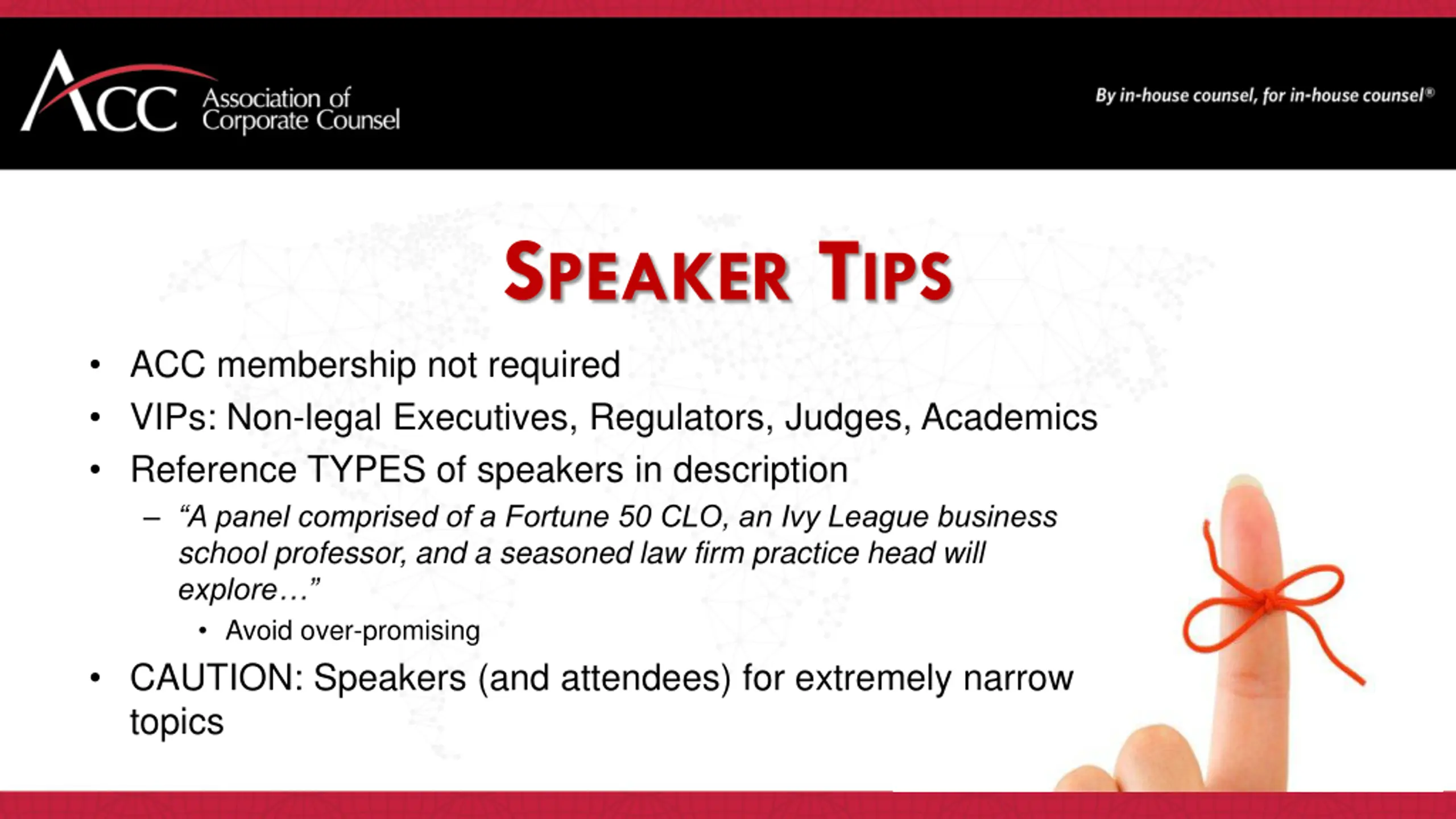 SPEAKER TIPS ACC membership not required VIPs: Non-legal Executives, Regulators, Judges, Academics Reference TYPES of speakers in description A panel comprised of a Fortune 50 CLO, an Ivy League business school professor, and a seasoned law firm practice head will explore Avoid over-promising CAUTION: Speakers (and attendees) for extremely narrow topics