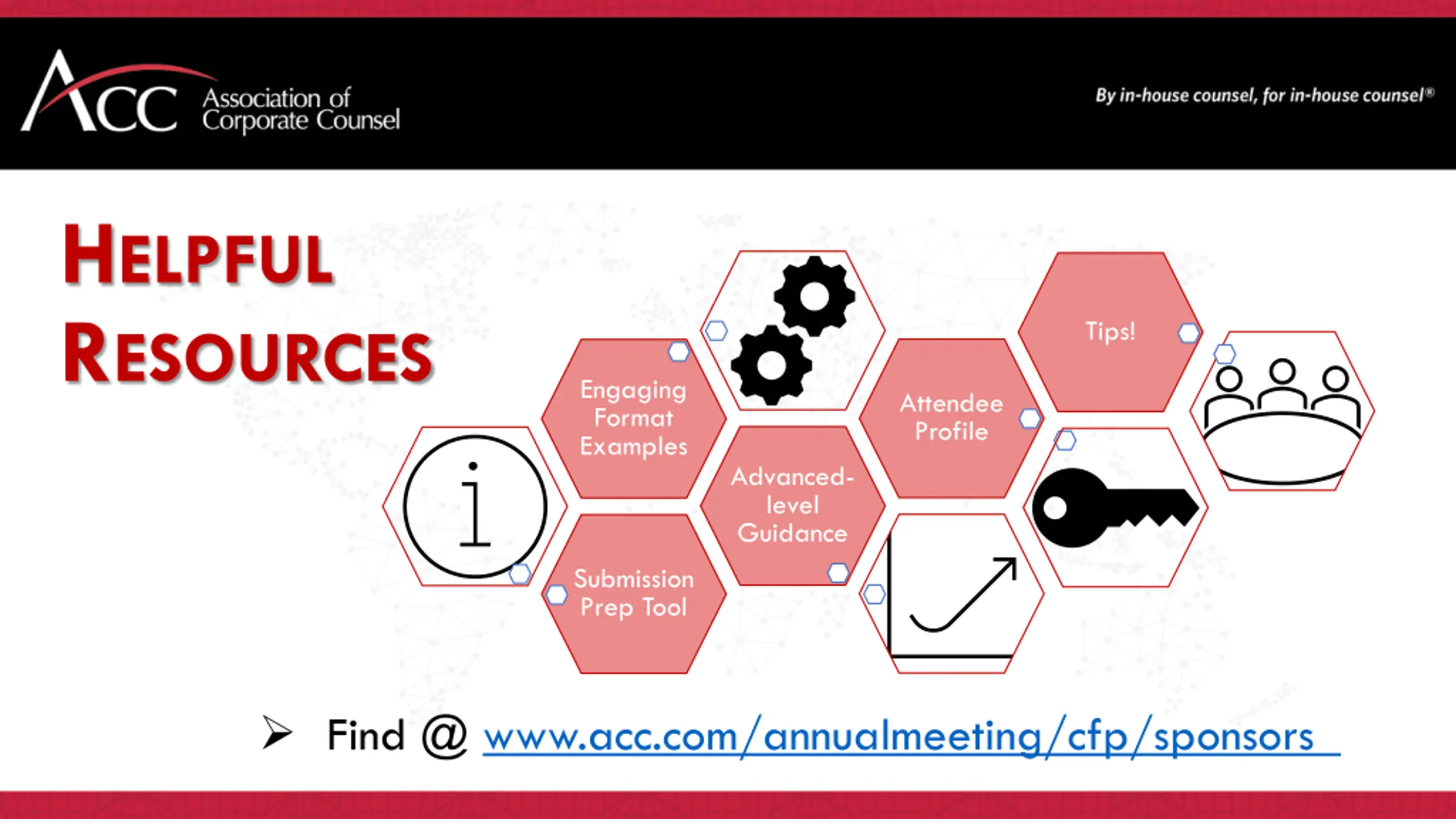 HELPFUL RESOURCES Tips! Engaging Format Examples Attendee Profile Advanced- level Guidance Submission Prep Tool Find @ www.acc.com/annualmeeting/cfp/sponsors