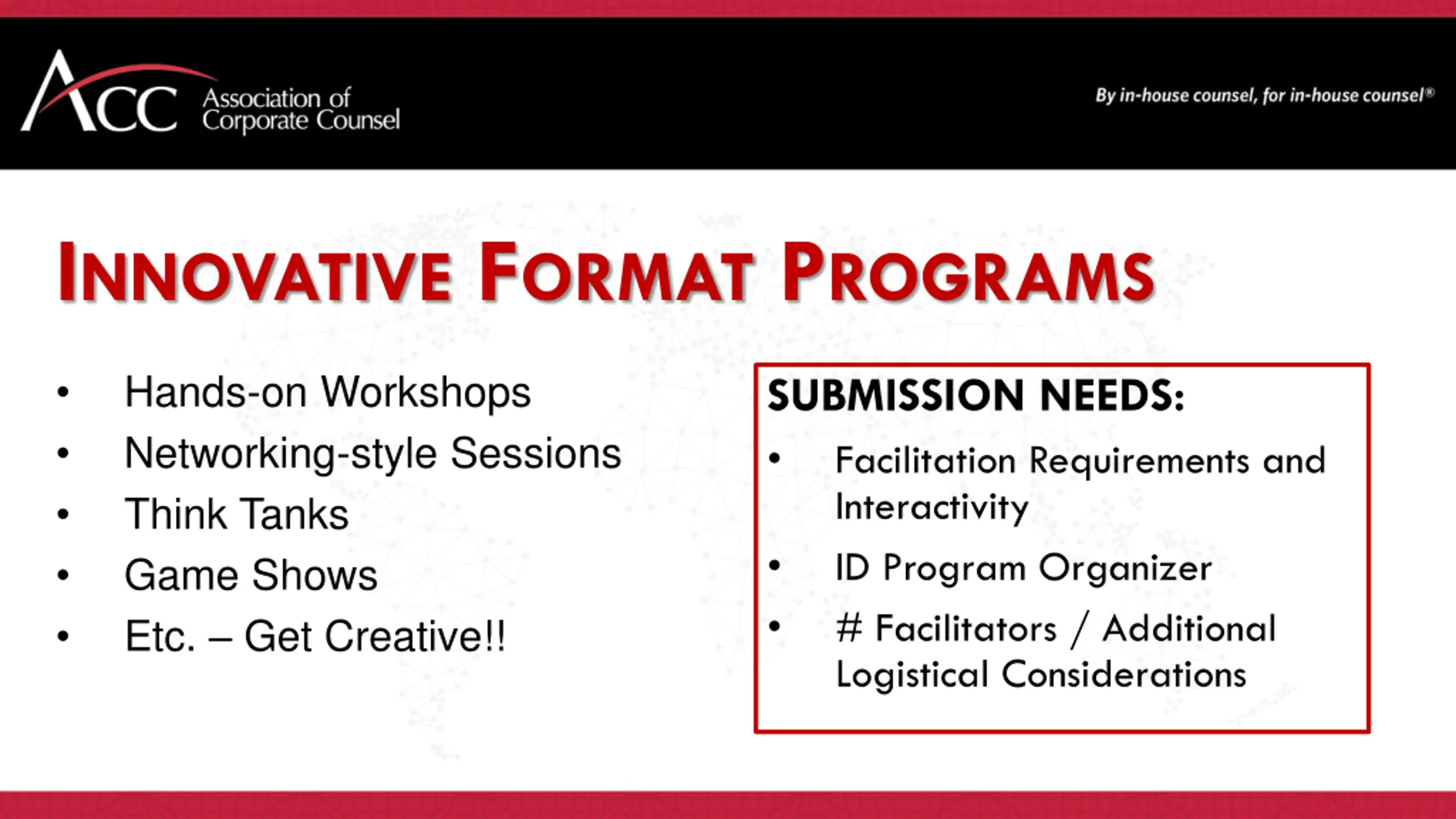INNOVATIVE FORMAT PROGRAMS Hands-on Workshops Networking-style Sessions Think Tanks Game Shows Etc. Get Creative!! SUBMISSION NEEDS: Facilitation Requirements and Interactivity ID Program Organizer # Facilitators / Additional Logistical Considerations