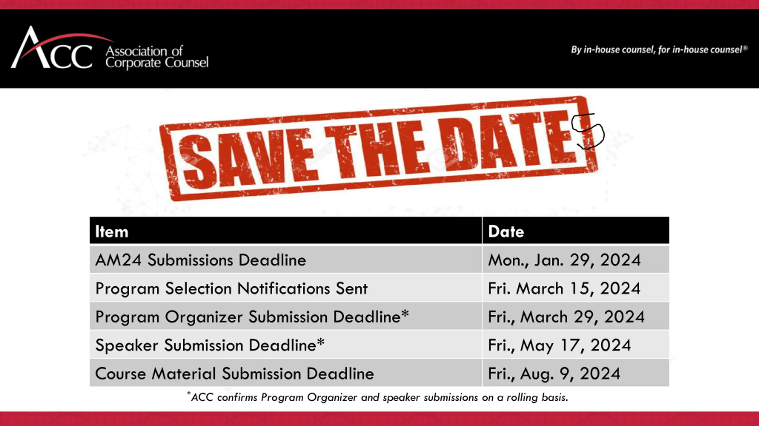 Item AM24 Submissions Deadline Program Selection Notifications Sent Program Organizer Submission Deadline* Speaker Submission Deadline* Course Material Submission Deadline Date Mon., Jan. 29, 2024 Fri. March 15, 2024 Fri., March 29, 2024 Fri., May 17, 2024 Fri., Aug. 9, 2024 *ACC confirms Program Organizer and speaker submissions on a rolling basis.