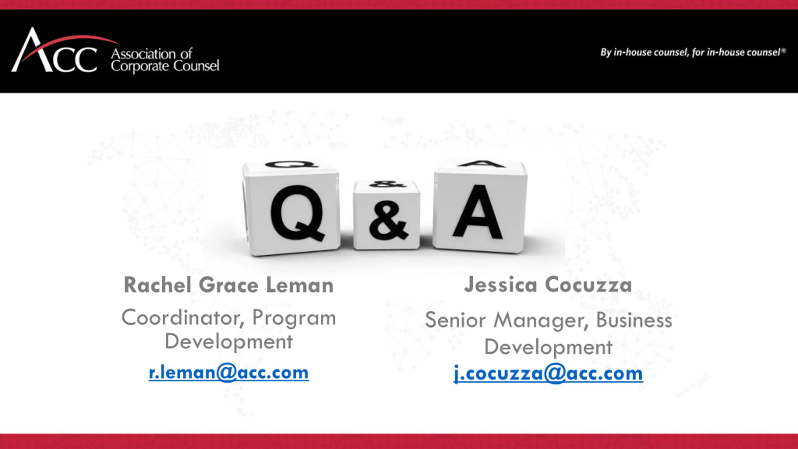Jessica Cocuzza Senior Manager, Business Development j.cocuzza@acc.com Rachel Grace Leman Coordinator, Program Development r.leman@acc.com
