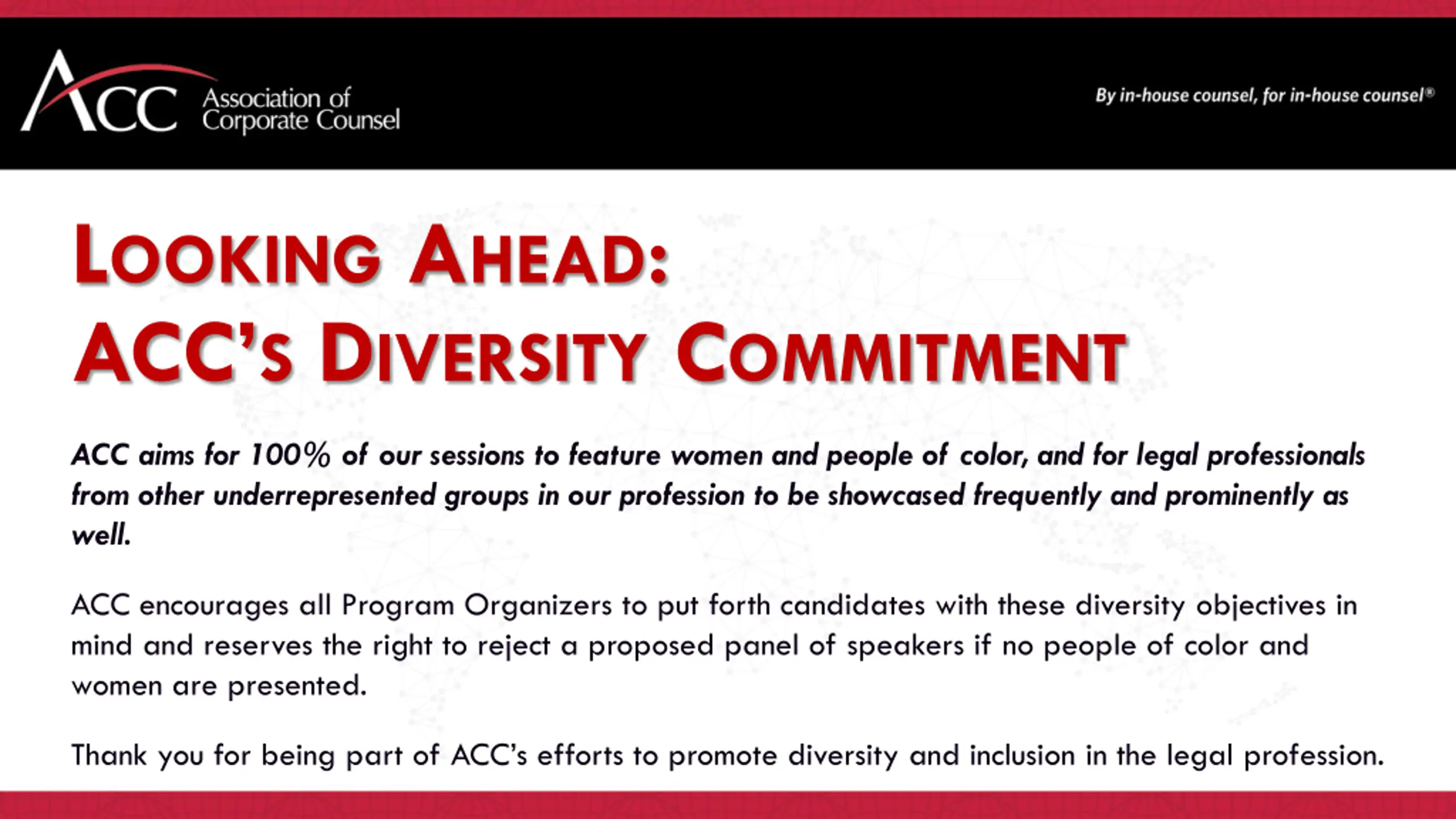 LOOKING AHEAD: ACC S DIVERSITY COMMITMENT ACC aims for 100% of our sessions to feature women and people of color, and for legal professionals from other underrepresented groups in our profession to be showcased frequently and prominently as well. ACC encourages all Program Organizers to put forth candidates with these diversity objectives in mind and reserves the right to reject a proposed panel of speakers if no people of color and women are presented. Thank you for being part of ACC s efforts to promote diversity and inclusion in the legal profession.
