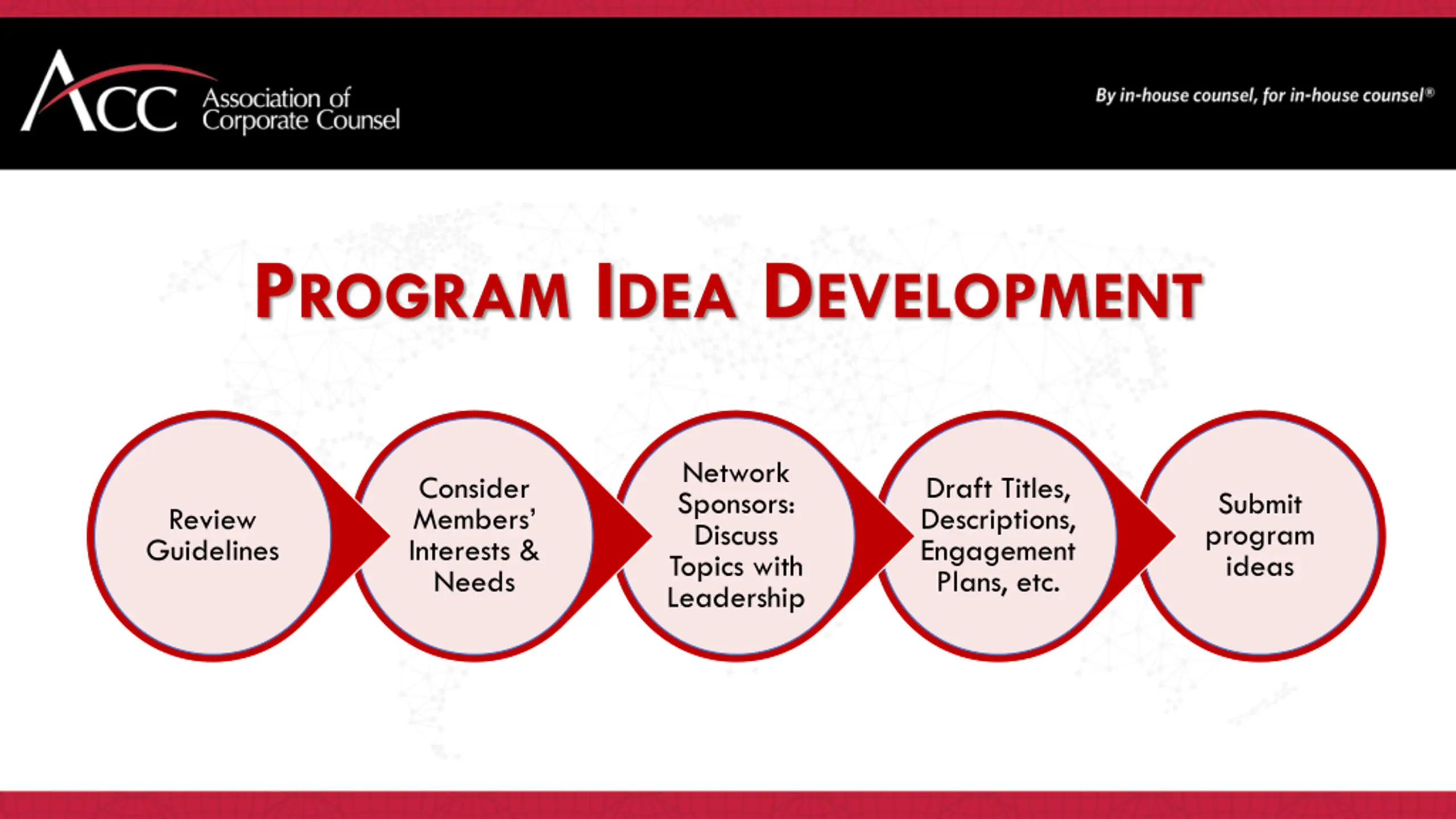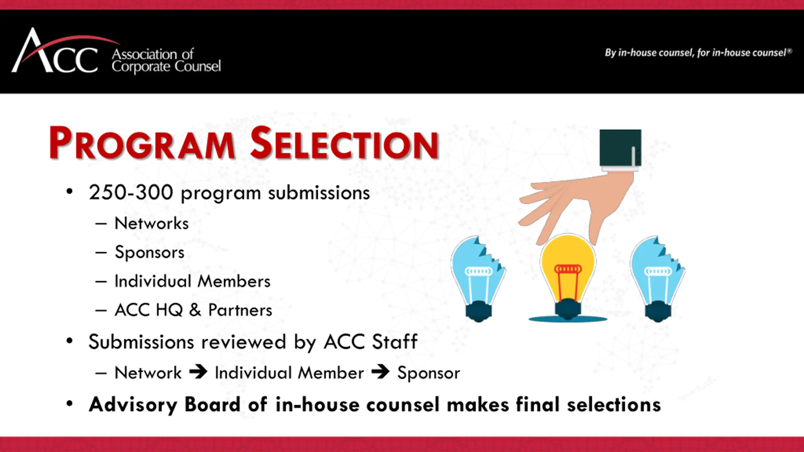 PROGRAM SELECTION 250-300 program submissions Networks Sponsors Individual Members ACC HQ & Partners Submissions reviewed by ACC Staff Network Individual Member Sponsor Advisory Board of in-house counsel makes final selections