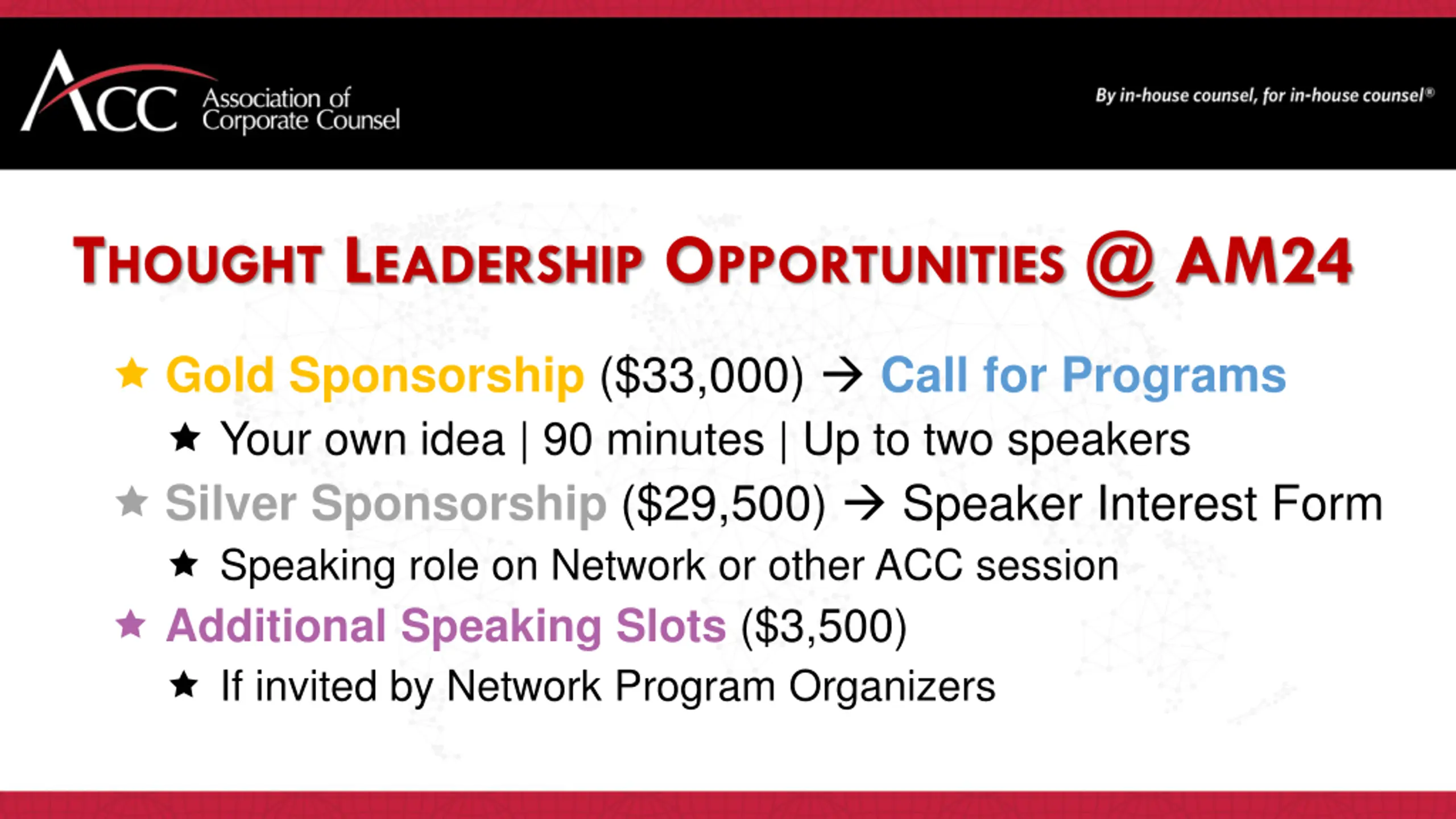 THOUGHT LEADERSHIP OPPORTUNITIES @ AM24 Gold Sponsorship ($33,000) Call for Programs Your own idea | 90 minutes | Up to two speakers Silver Sponsorship ($29,500) Speaker Interest Form Speaking role on Network or other ACC session Additional Speaking Slots ($3,500) If invited by Network Program Organizers