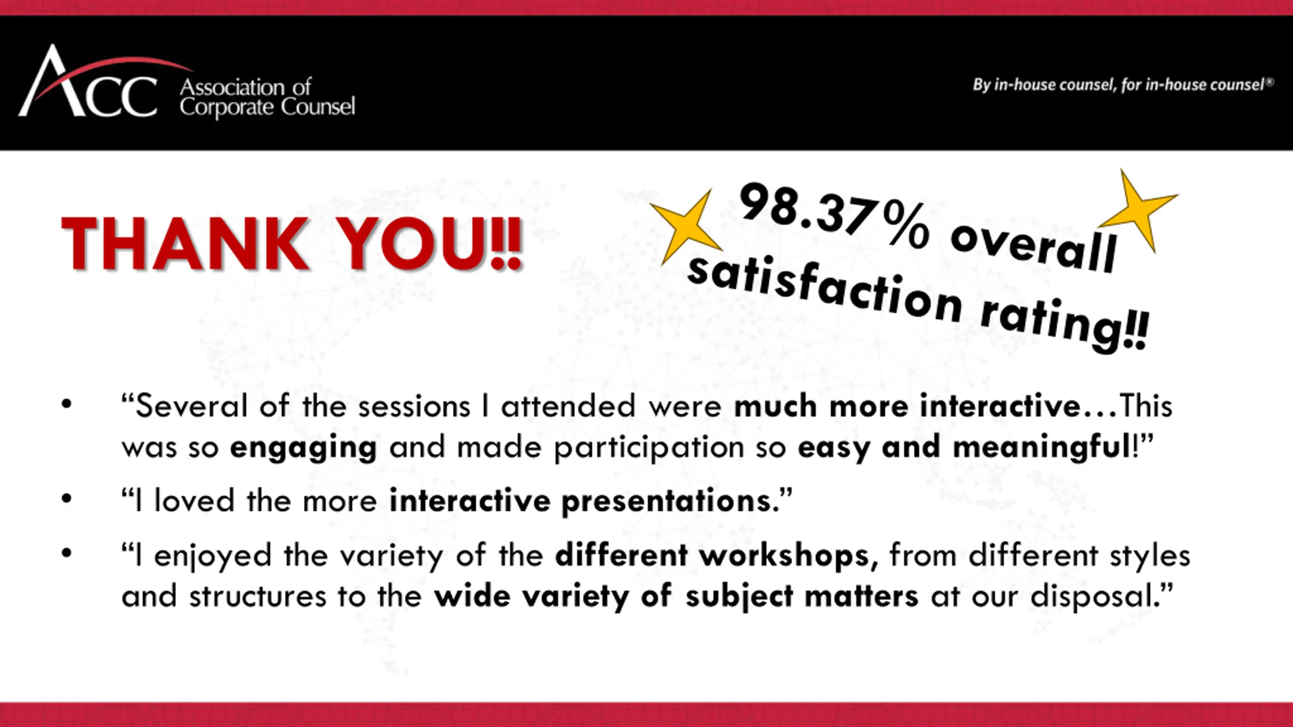 THANK YOU!! Several of the sessions I attended were much more interactive This was so engaging and made participation so easy and meaningful! I loved the more interactive presentations. I enjoyed the variety of the different workshops, from different styles and structures to the wide variety of subject matters at our disposal.