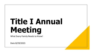 The Annual Meeting of Title I Parents is a crucial event mandated by the Every Student Succeeds Act of 2015. It aims to inform parents about their school's Title I participation, explain Title I requirements, and outline parental rights to engagement. Being a Title I school involves receiving federal funding to support students in meeting academic standards, with a focus on parent and family involvement. The 1% set-aside ensures funds are allocated for meaningful parent engagement, and parents have a say in how this money is used. Parents also play a role in the development of the LEA Consolidated Plan and the LEA Parent and Family Engagement Plan, which detail how Title I funds will be utilized and how parental involvement will be encouraged. These plans highlight the integration of federal funds, student assessments, support for struggling students, and strategies for effective parent engagement. Parent engagement is essential for enhancing student success and building strong school-community partnerships.