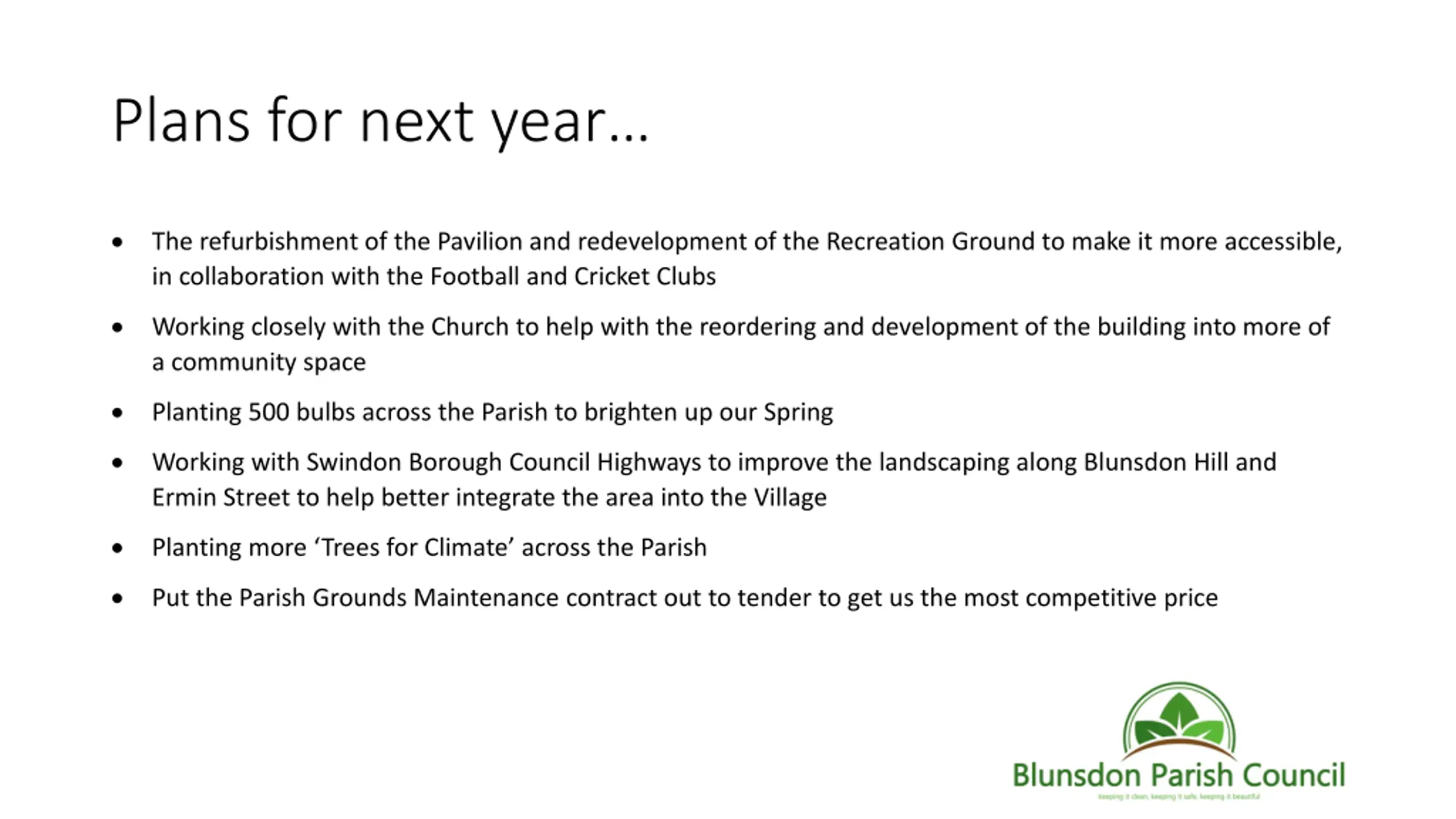 Plans for next year The refurbishment of the Pavilion and redevelopment of the Recreation Ground to make it more accessible, in collaboration with the Football and Cricket Clubs Working closely with the Church to help with the reordering and development of the building into more of a community space Planting 500 bulbs across the Parish to brighten up our Spring Working with Swindon Borough Council Highways to improve the landscaping along Blunsdon Hill and Ermin Street to help better integrate the area into the Village Planting more Trees for Climate across the Parish Put the Parish Grounds Maintenance contract out to tender to get us the most competitive price
