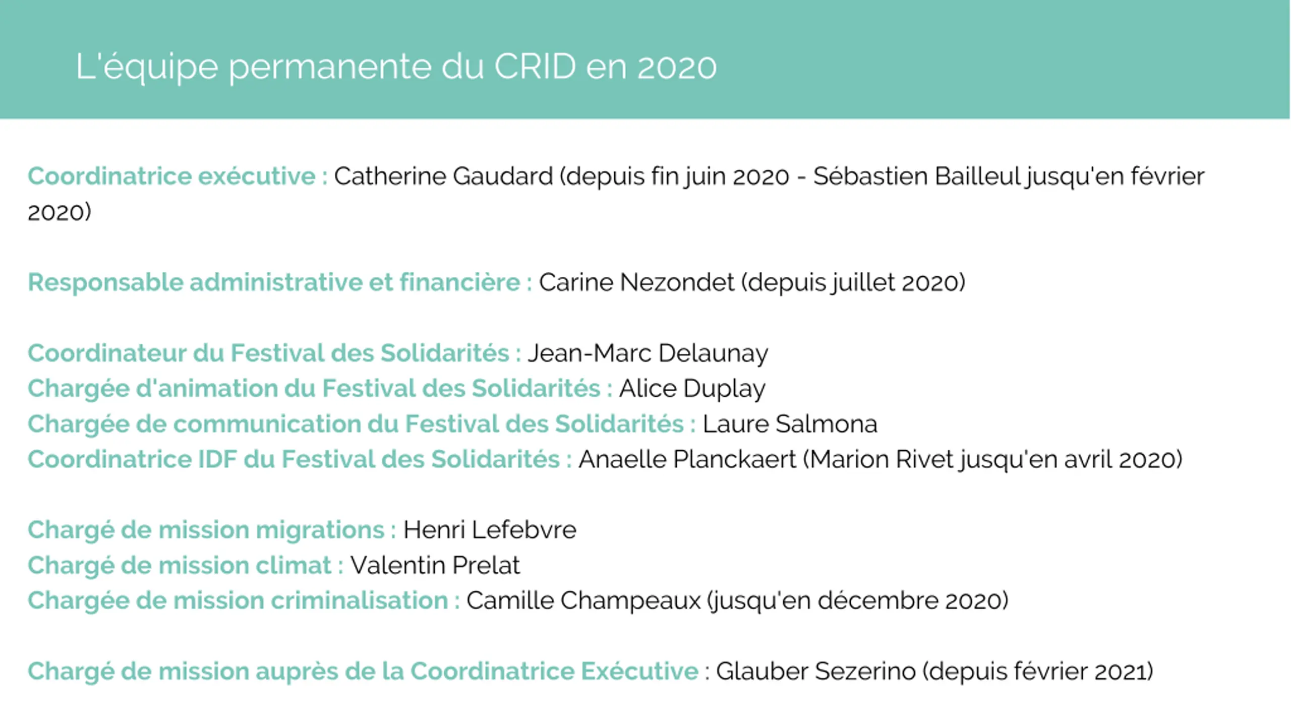 L'quipe permanente du CRID en 2020 Coordinatrice ex cutive : Catherine Gaudard (depuis fin juin 2020 - S bastien Bailleul jusqu'en f vrier 2020) Responsable administrative et financi re : Carine Nezondet (depuis juillet 2020) Coordinateur du Festival des Solidarit s : Jean-Marc Delaunay Charg e d'animation du Festival des Solidarit s : Alice Duplay Charg e de communication du Festival des Solidarit s : Laure Salmona Coordinatrice IDF du Festival des Solidarit s : Anaelle Planckaert (Marion Rivet jusqu'en avril 2020) Charg de mission migrations : Henri Lefebvre Charg de mission climat : Valentin Prelat Charg e de mission criminalisation : Camille Champeaux (jusqu'en d cembre 2020) Charg de mission aupr s de la Coordinatrice Ex cutive : Glauber Sezerino (depuis f vrier 2021)