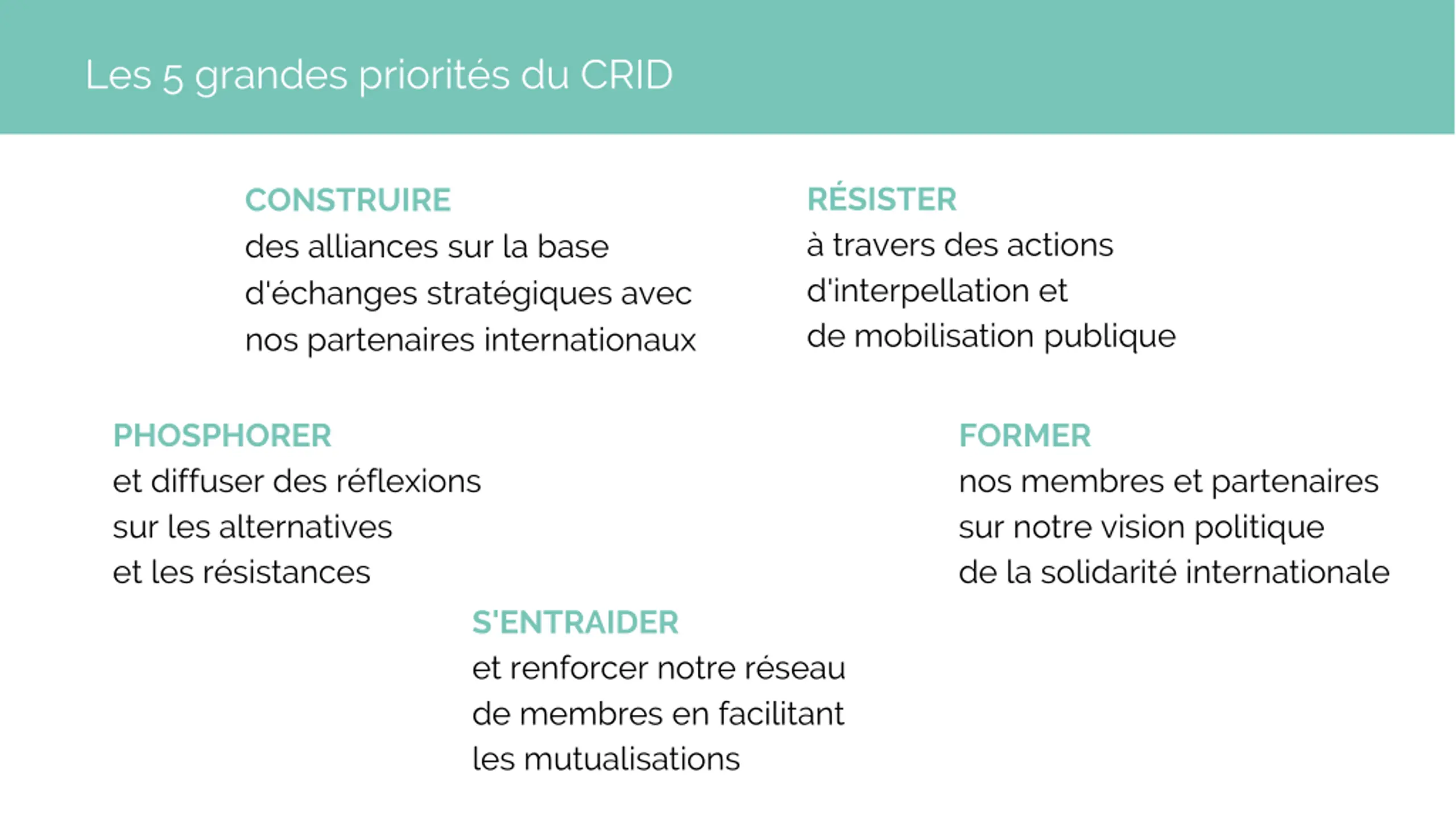 Les 5 grandes priorits du CRID R SISTER travers des actions d'interpellation et de mobilisation publique CONSTRUIRE des alliances sur la base d' changes strat giques avec nos partenaires internationaux PHOSPHORER et diffuser des r flexions sur les alternatives et les r sistances FORMER nos membres et partenaires sur notre vision politique de la solidarit internationale S'ENTRAIDER et renforcer notre r seau de membres en facilitant les mutualisations