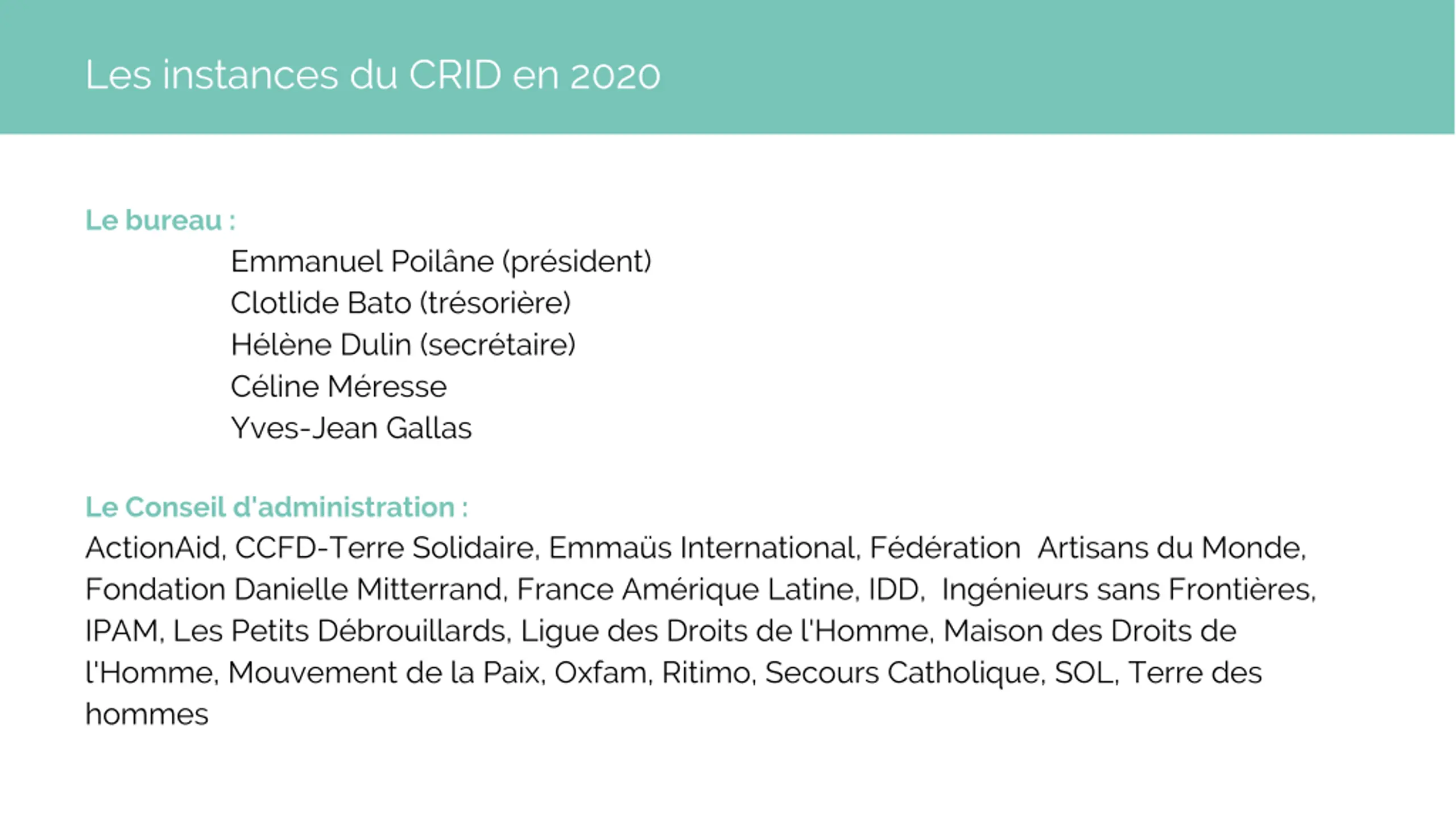 Les instances du CRID en 2020 Le bureau : Emmanuel Poil ne (pr sident) Clotlide Bato (tr sori re) H l ne Dulin (secr taire) C line M resse Yves-Jean Gallas Le Conseil d'administration : ActionAid, CCFD-Terre Solidaire, Emma s International, F d ration Artisans du Monde, Fondation Danielle Mitterrand, France Am rique Latine, IDD, Ing nieurs sans Fronti res, IPAM, Les Petits D brouillards, Ligue des Droits de l'Homme, Maison des Droits de l'Homme, Mouvement de la Paix, Oxfam, Ritimo, Secours Catholique, SOL, Terre des hommes