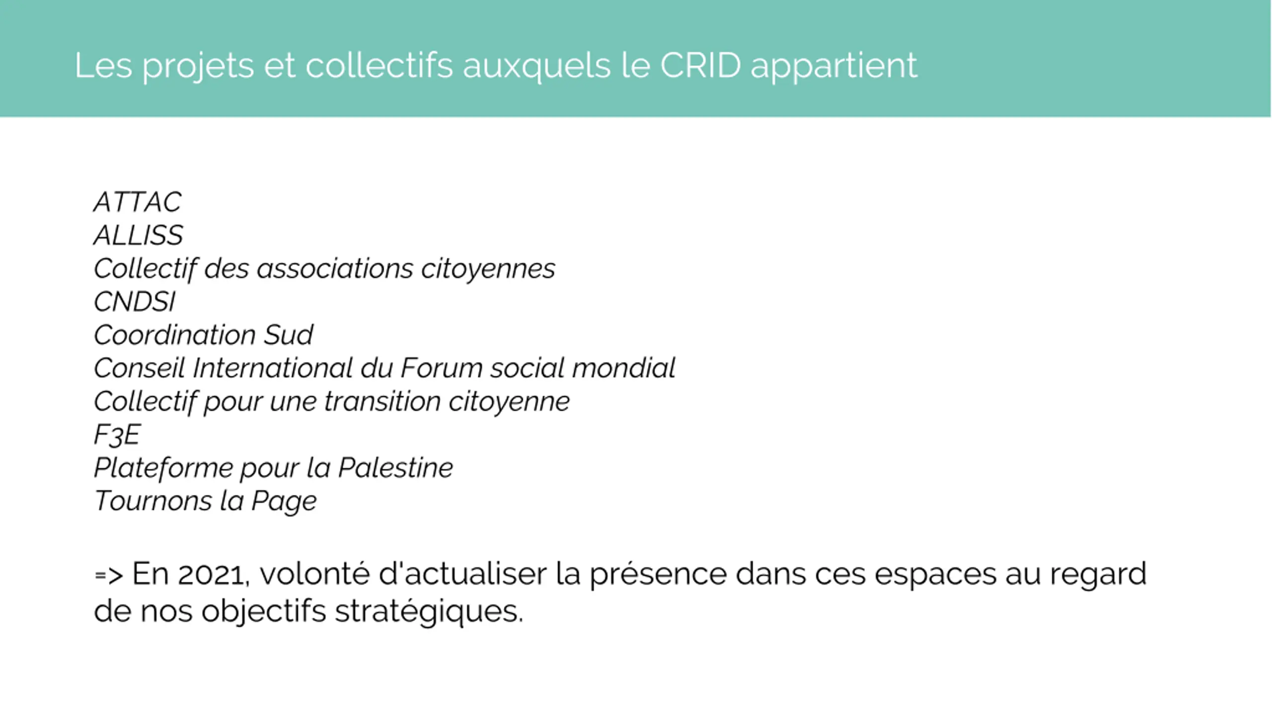 Les projets et collectifs auxquels le CRID appartient ATTAC ALLISS Collectif des associations citoyennes CNDSI Coordination Sud Conseil International du Forum social mondial Collectif pour une transition citoyenne F3E Plateforme pour la Palestine Tournons la Page => En 2021, volont d'actualiser la pr sence dans ces espaces au regard de nos objectifs strat giques.