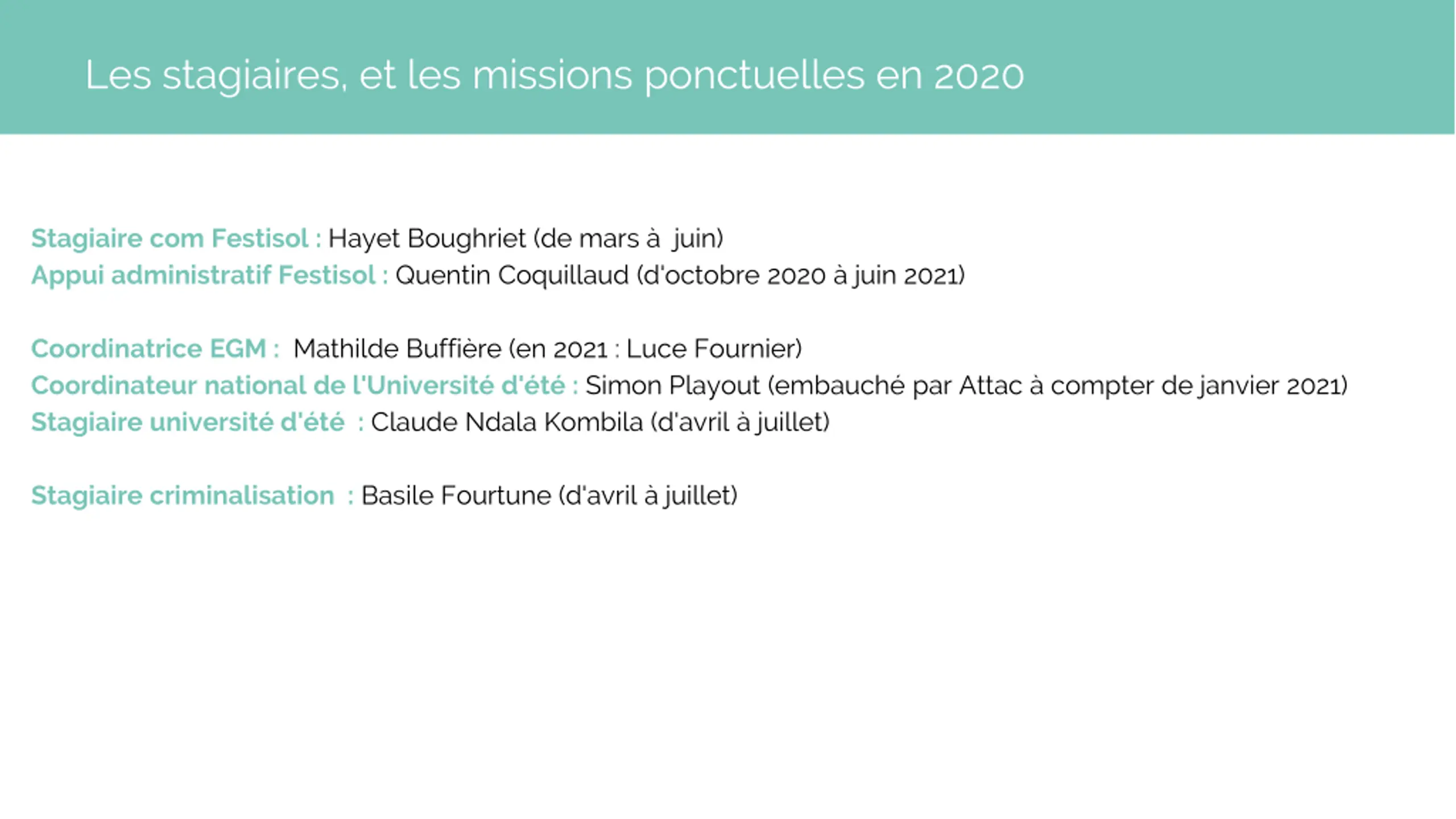 Les stagiaires, et les missions ponctuelles en 2020 Stagiaire com Festisol : Hayet Boughriet (de mars juin) Appui administratif Festisol : Quentin Coquillaud (d'octobre 2020 juin 2021) Coordinatrice EGM : Mathilde Buffi re (en 2021 : Luce Fournier) Coordinateur national de l'Universit d' t : Simon Playout (embauch par Attac compter de janvier 2021) Stagiaire universit d' t : Claude Ndala Kombila (d'avril juillet) Stagiaire criminalisation : Basile Fourtune (d'avril juillet)