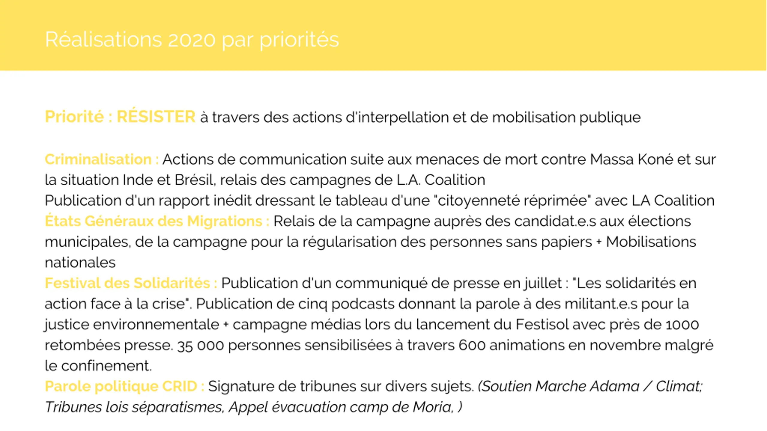 Ralisations 2020 par priorits Priorit : R SISTER travers des actions d'interpellation et de mobilisation publique Criminalisation :Actions de communication suite aux menaces de mort contre Massa Kon et sur la situation Inde et Br sil, relais des campagnes de L.A. Coalition Publication d'un rapport in dit dressant le tableau d'une "citoyennet r prim e" avec LA Coalition tats G n raux des Migrations : Relais de la campagne aupr s des candidat.e.s aux lections municipales, de la campagne pour la r gularisation des personnes sans papiers + Mobilisations nationales Festival des Solidarit s : Publication d'un communiqu de presse en juillet : "Les solidarit s en action face la crise". Publication de cinq podcasts donnant la parole des militant.e.s pour la justice environnementale + campagne m dias lors du lancement du Festisol avec pr s de 1000 retomb es presse. 35 000 personnes sensibilis es travers 600 animations en novembre malgr le confinement. Parole politique CRID : Signature de tribunes sur divers sujets. (Soutien Marche Adama / Climat; Tribunes lois s paratismes, Appel vacuation camp de Moria, )