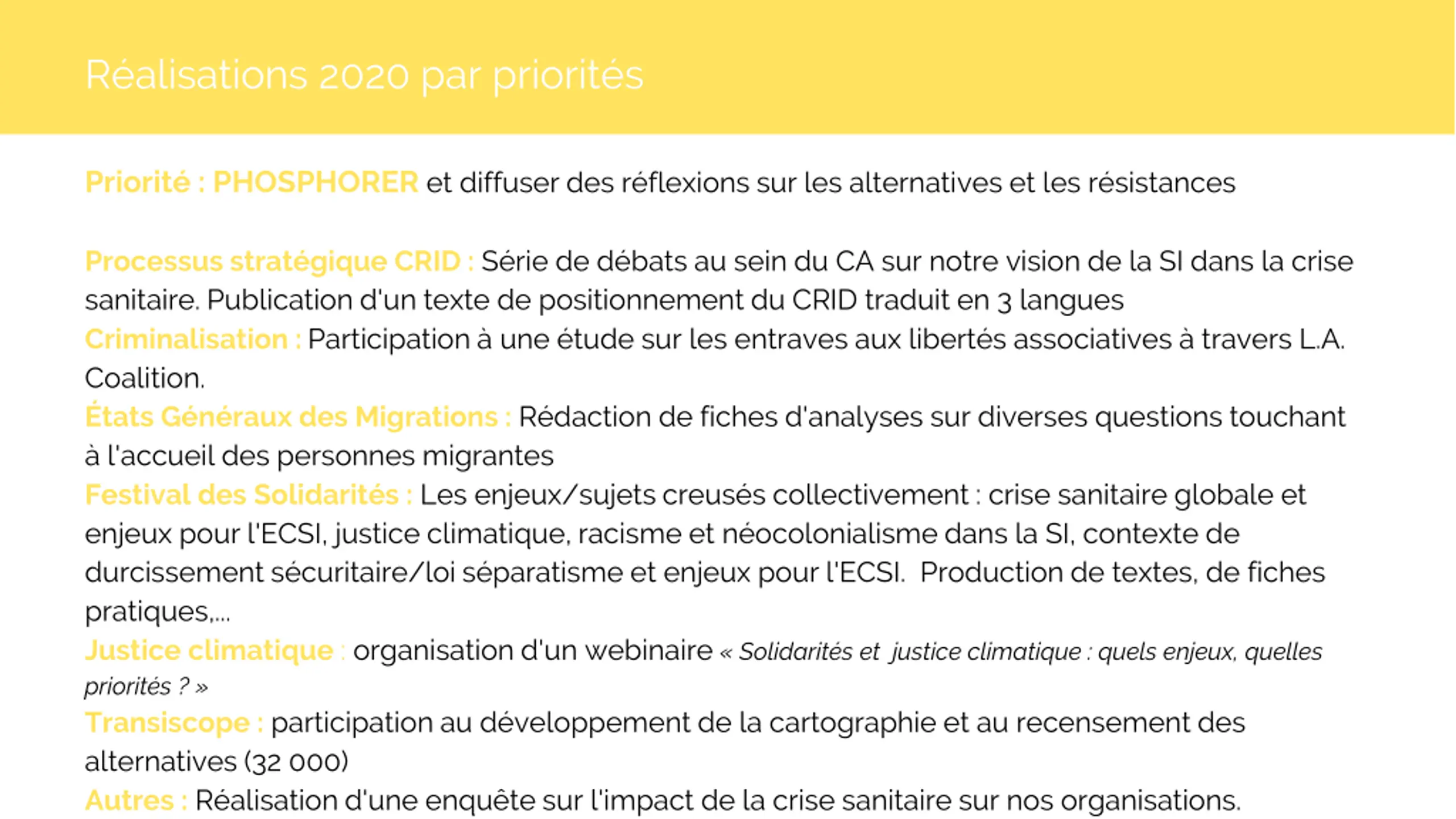 Ralisations 2020 par priorits Priorit : PHOSPHORER et diffuser des r flexions sur les alternatives et les r sistances Processus strat gique CRID : S rie de d bats au sein du CA sur notre vision de la SI dans la crise sanitaire. Publication d'un texte de positionnement du CRID traduit en 3 langues Criminalisation :Participation une tude sur les entraves aux libert s associatives travers L.A. Coalition. tats G n raux des Migrations : R daction de fiches d'analyses sur diverses questions touchant l'accueil des personnes migrantes Festival des Solidarit s : Les enjeux/sujets creus s collectivement : crise sanitaire globale et enjeux pour l'ECSI, justice climatique, racisme et n ocolonialisme dans la SI, contexte de durcissement s curitaire/loi s paratisme et enjeux pour l'ECSI. Production de textes, de fiches pratiques,... Justice climatique : organisation d'un webinaire Solidarit s et justice climatique : quels enjeux, quelles priorit s ? Transiscope : participation au d veloppement de la cartographie et au recensement des alternatives (32 000) Autres : R alisation d'une enqu te sur l'impact de la crise sanitaire sur nos organisations.