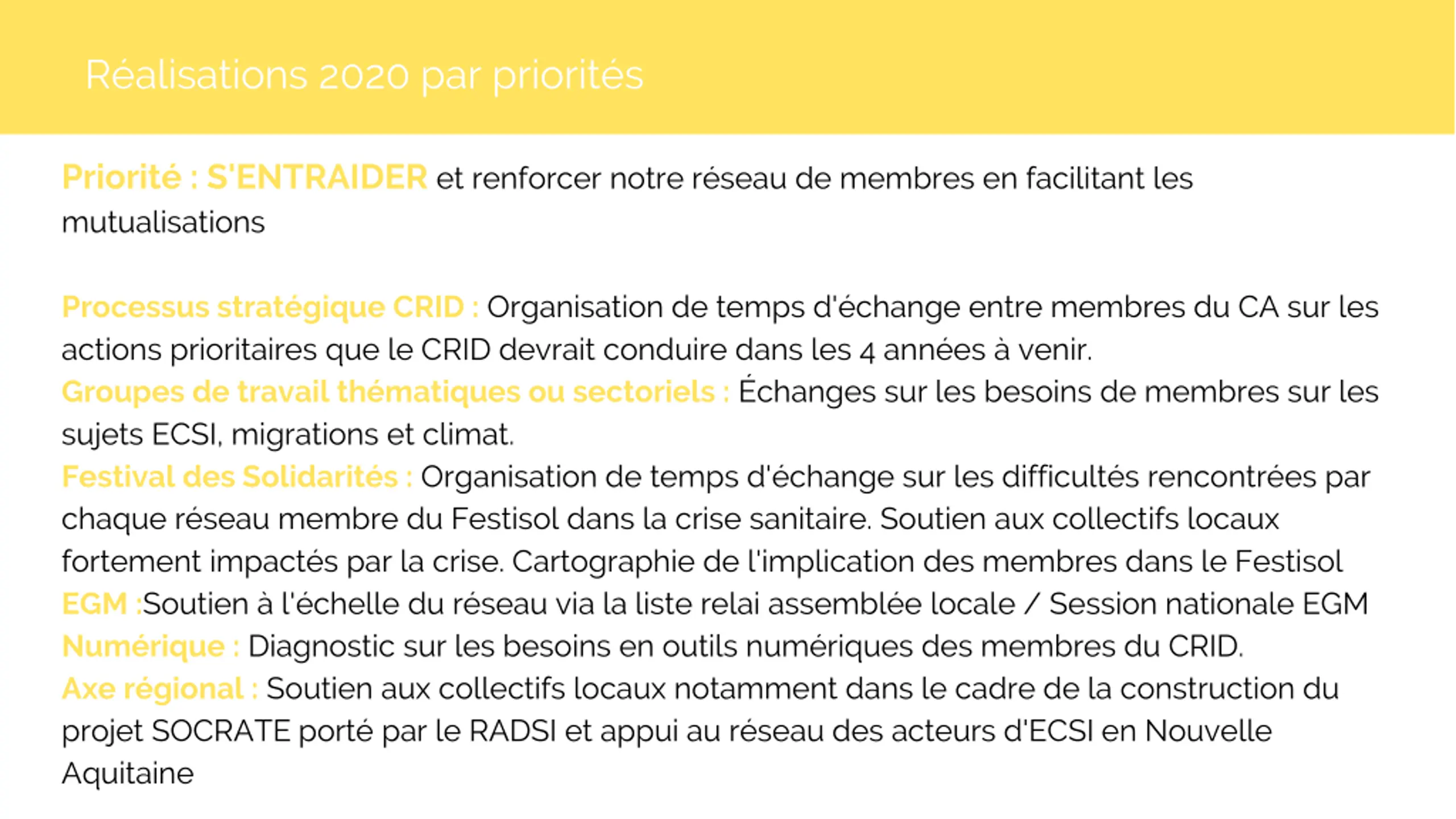 Ralisations 2020 par priorits Priorit : S'ENTRAIDER et renforcer notre r seau de membres en facilitant les mutualisations Processus strat gique CRID : Organisation de temps d' change entre membres du CA sur les actions prioritaires que le CRID devrait conduire dans les 4 ann es venir. Groupes de travail th matiques ou sectoriels : changes sur les besoins de membres sur les sujets ECSI, migrations et climat. Festival des Solidarit s : Organisation de temps d' change sur les difficult s rencontr es par chaque r seau membre du Festisol dans la crise sanitaire. Soutien aux collectifs locaux fortement impact s par la crise. Cartographie de l'implication des membres dans le Festisol EGM :Soutien l' chelle du r seau via la liste relai assembl e locale / Session nationale EGM Num rique : Diagnostic sur les besoins en outils num riques des membres du CRID. Axe r gional : Soutien aux collectifs locaux notamment dans le cadre de la construction du projet SOCRATE port par le RADSI et appui au r seau des acteurs d'ECSI en Nouvelle Aquitaine