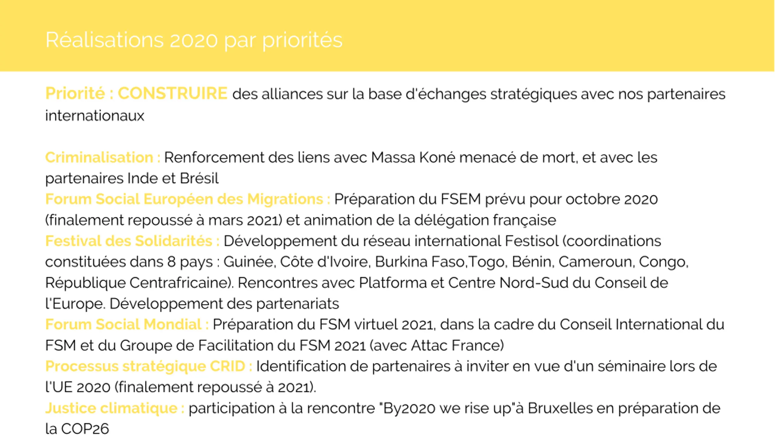 Ralisations 2020 par priorits Priorit : CONSTRUIRE des alliances sur la base d' changes strat giques avec nos partenaires internationaux Criminalisation :Renforcement des liens avec Massa Kon menac de mort, et avec les partenaires Inde et Br sil Forum Social Europ en des Migrations : Pr paration du FSEM pr vu pour octobre 2020 (finalement repouss mars 2021) et animation de la d l gation fran aise Festival des Solidarit s : D veloppement du r seau international Festisol (coordinations constitu es dans 8 pays : Guin e, C te d'Ivoire, Burkina Faso,Togo, B nin, Cameroun, Congo, R publique Centrafricaine). Rencontres avec Platforma et Centre Nord-Sud du Conseil de l'Europe. D veloppement des partenariats Forum Social Mondial : Pr paration du FSM virtuel 2021, dans la cadre du Conseil International du FSM et du Groupe de Facilitation du FSM 2021 (avec Attac France) Processus strat gique CRID : Identification de partenaires inviter en vue d'un s minaire lors de l'UE 2020 (finalement repouss 2021). Justice climatique : participation la rencontre "By2020 we rise up" Bruxelles en pr paration de la COP26