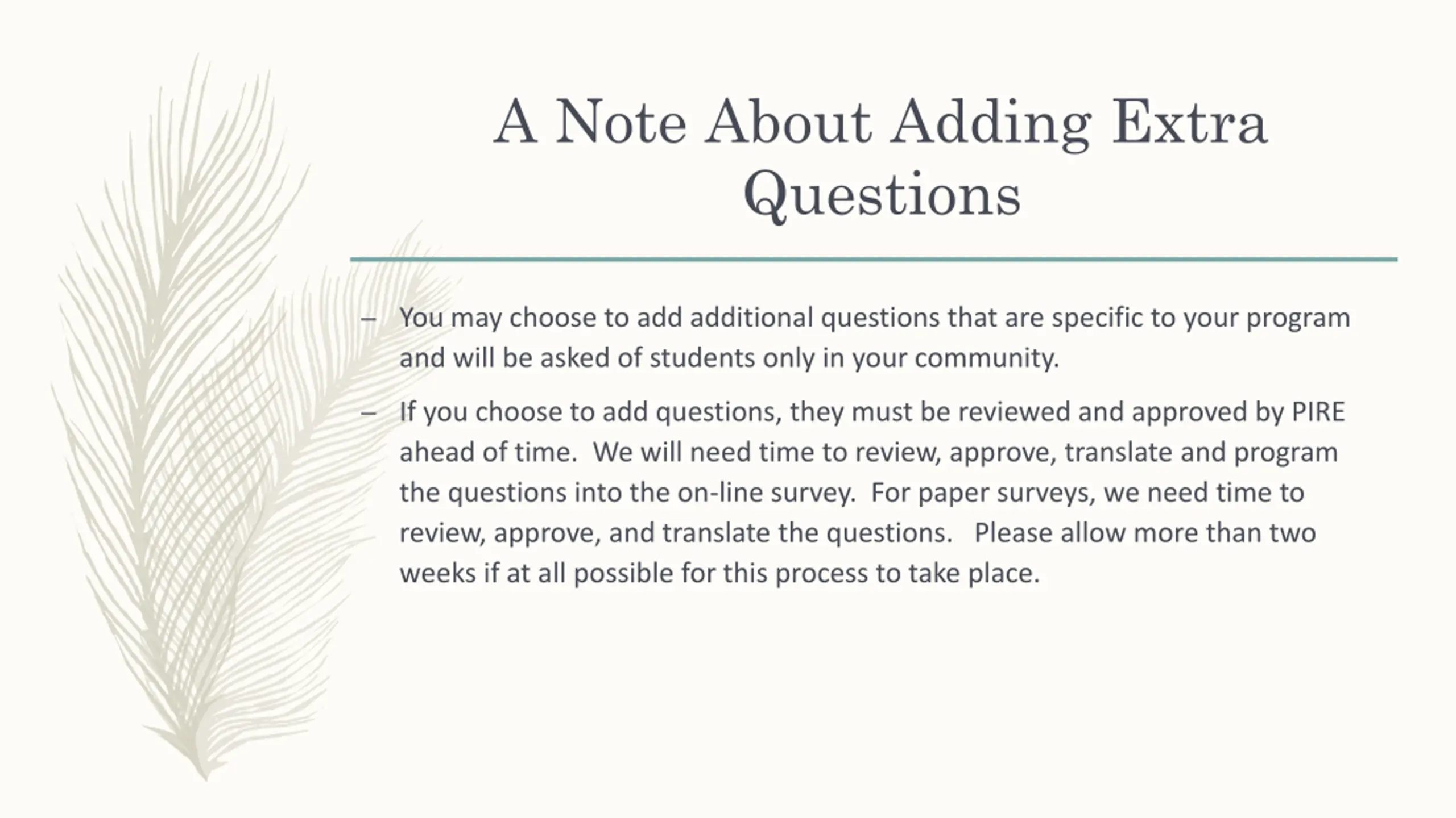 A Note About Adding Extra Questions You may choose to add additional questions that are specific to your program and will be asked of students only in your community. If you choose to add questions, they must be reviewed and approved by PIRE ahead of time. We will need time to review, approve, translate and program the questions into the on-line survey. For paper surveys, we need time to review, approve, and translate the questions. Please allow more than two weeks if at all possible for this process to take place.