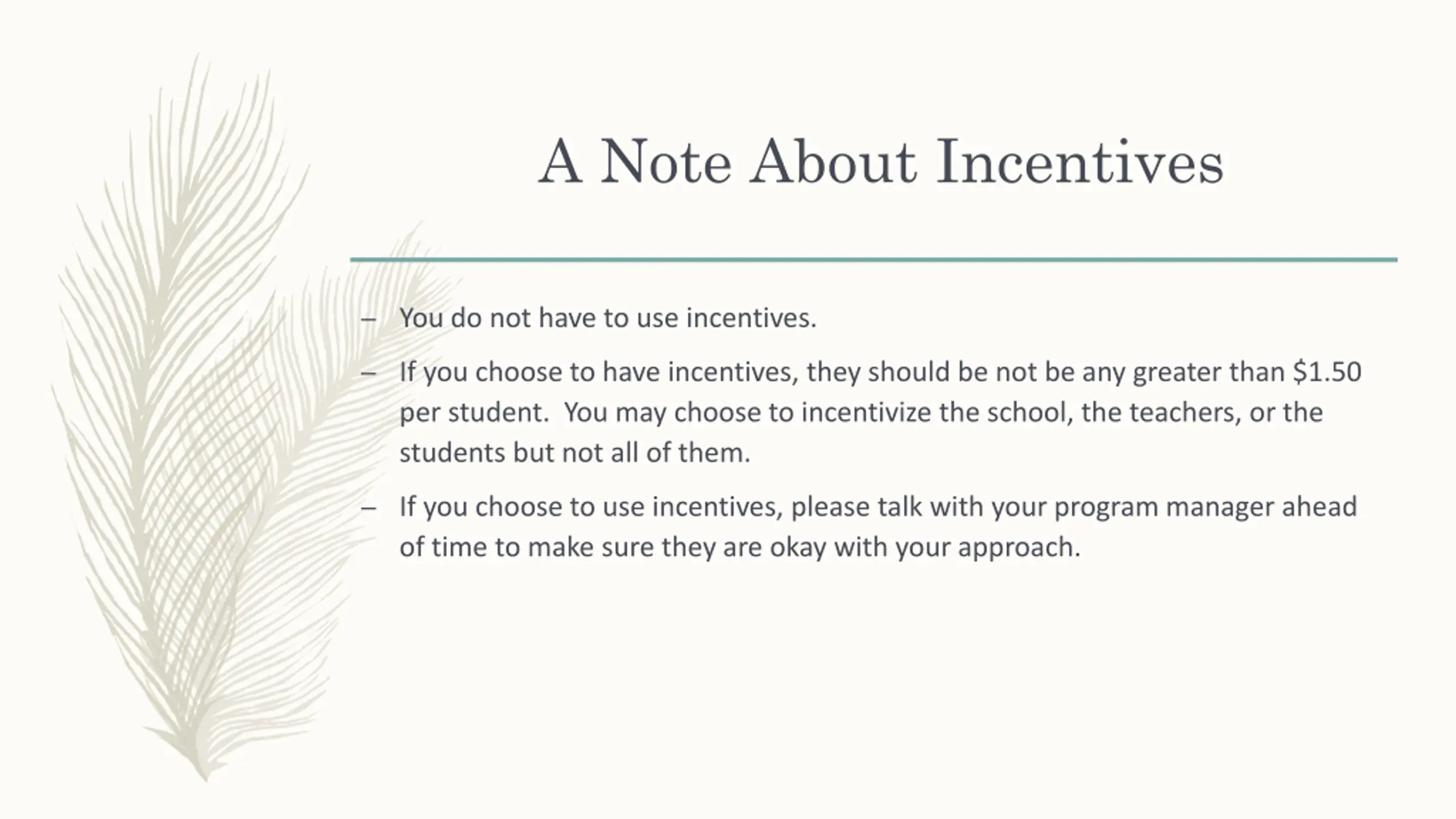 A Note About Incentives You do not have to use incentives. If you choose to have incentives, they should be not be any greater than $1.50 per student. You may choose to incentivize the school, the teachers, or the students but not all of them. If you choose to use incentives, please talk with your program manager ahead of time to make sure they are okay with your approach.