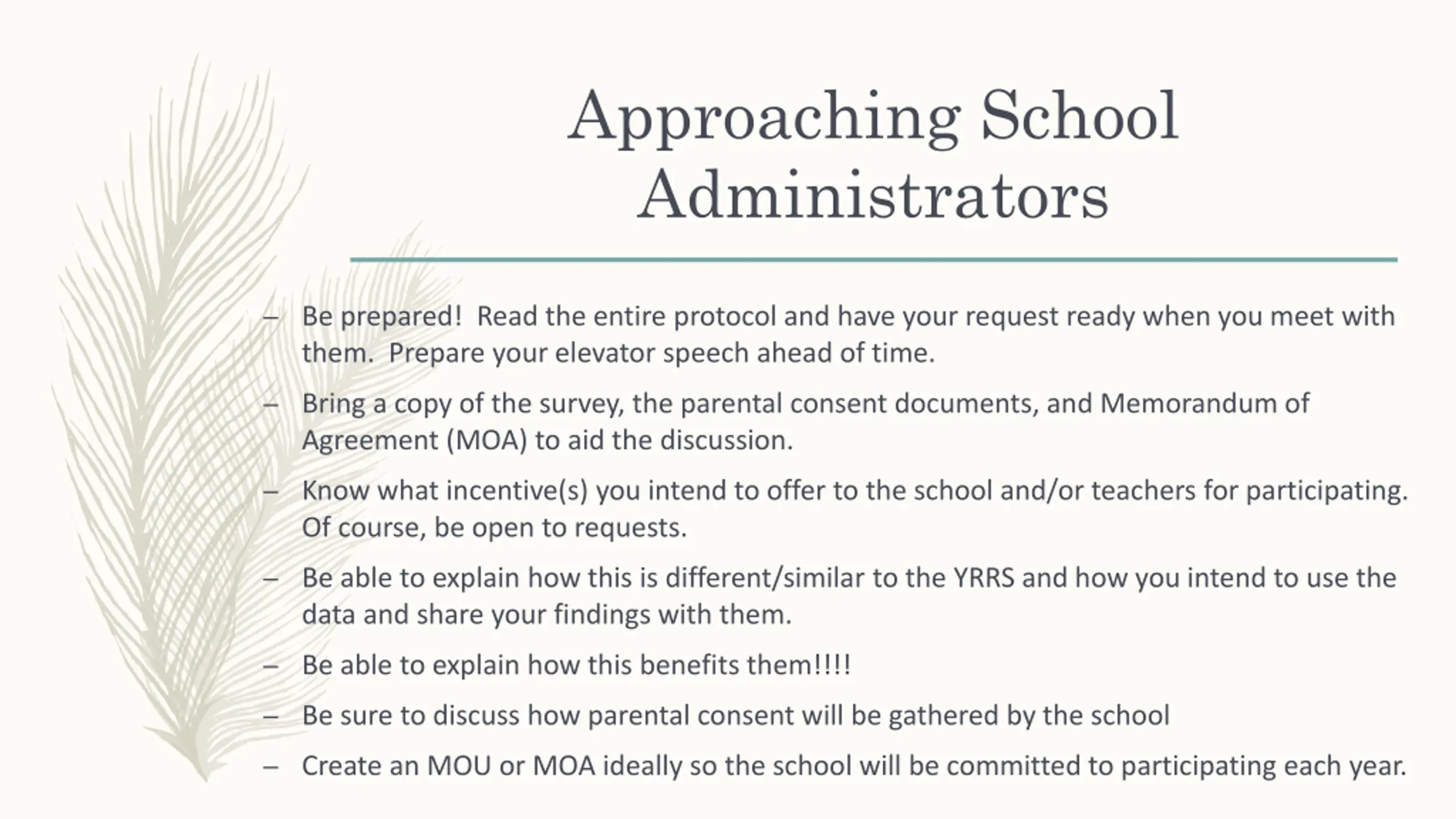 Approaching School Administrators Be prepared! Read the entire protocol and have your request ready when you meet with them. Prepare your elevator speech ahead of time. Bring a copy of the survey, the parental consent documents, and Memorandum of Agreement (MOA) to aid the discussion. Know what incentive(s) you intend to offer to the school and/or teachers for participating. Of course, be open to requests. Be able to explain how this is different/similar to the YRRS and how you intend to use the data and share your findings with them. Be able to explain how this benefits them!!!! Be sure to discuss how parental consent will be gathered by the school Create an MOU or MOA ideally so the school will be committed to participating each year.