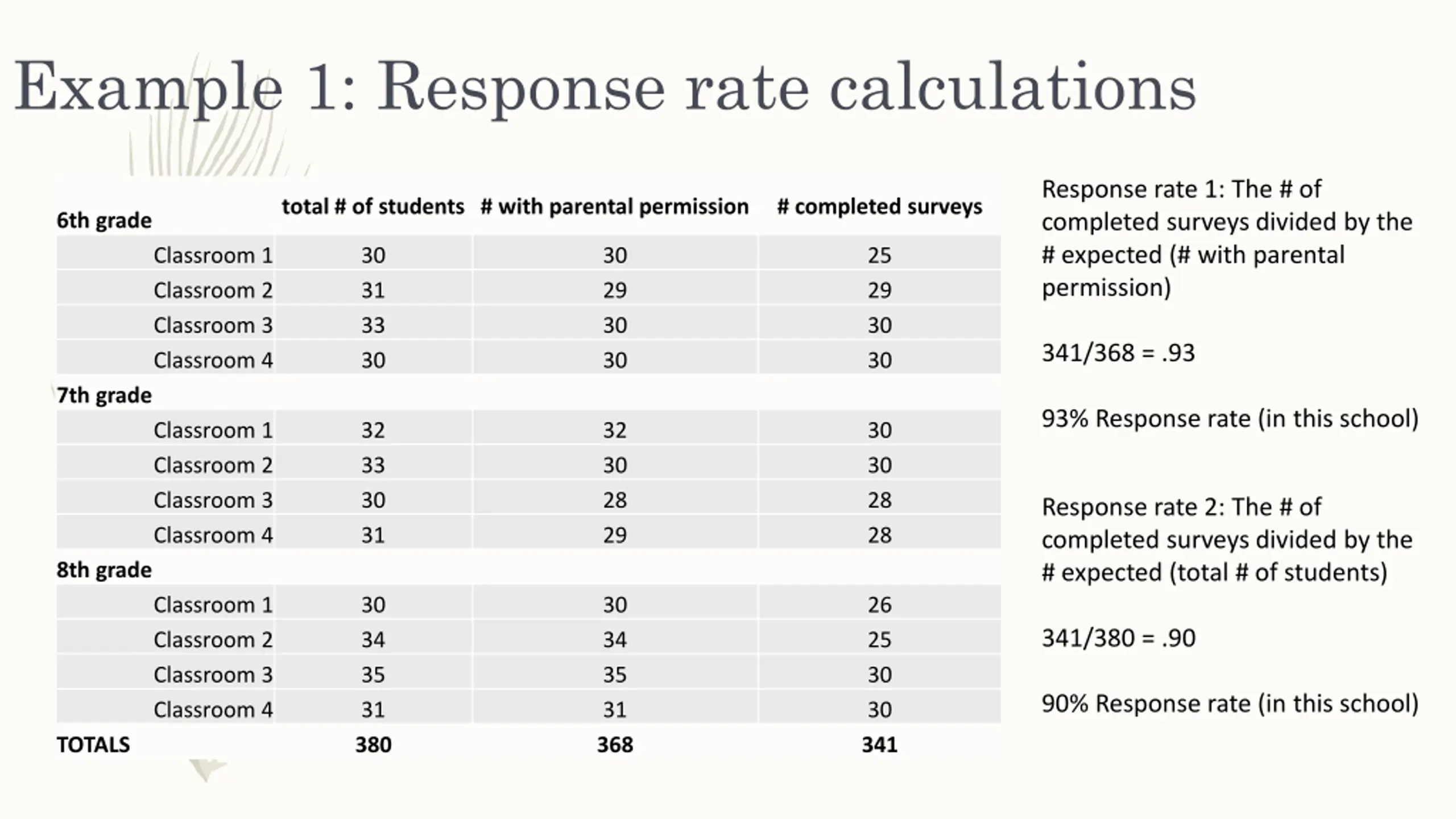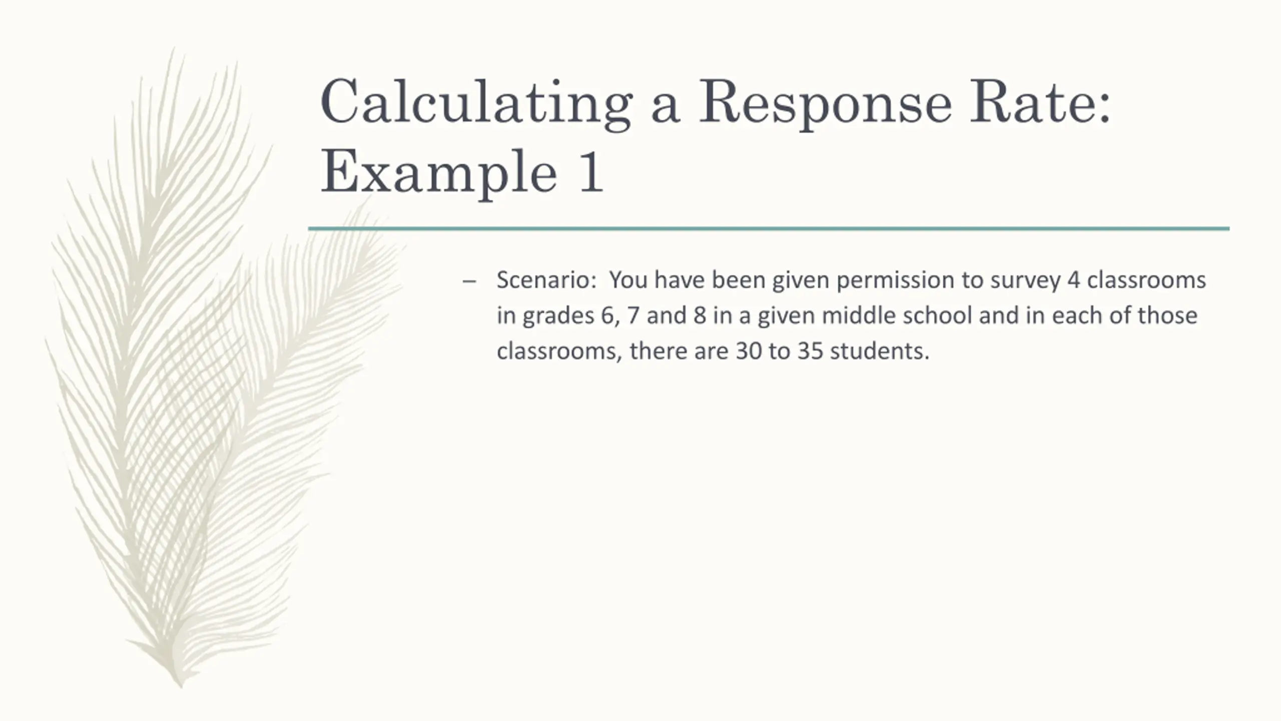 Calculating a Response Rate: Example 1 Scenario: You have been given permission to survey 4 classrooms in grades 6, 7 and 8 in a given middle school and in each of those classrooms, there are 30 to 35 students.