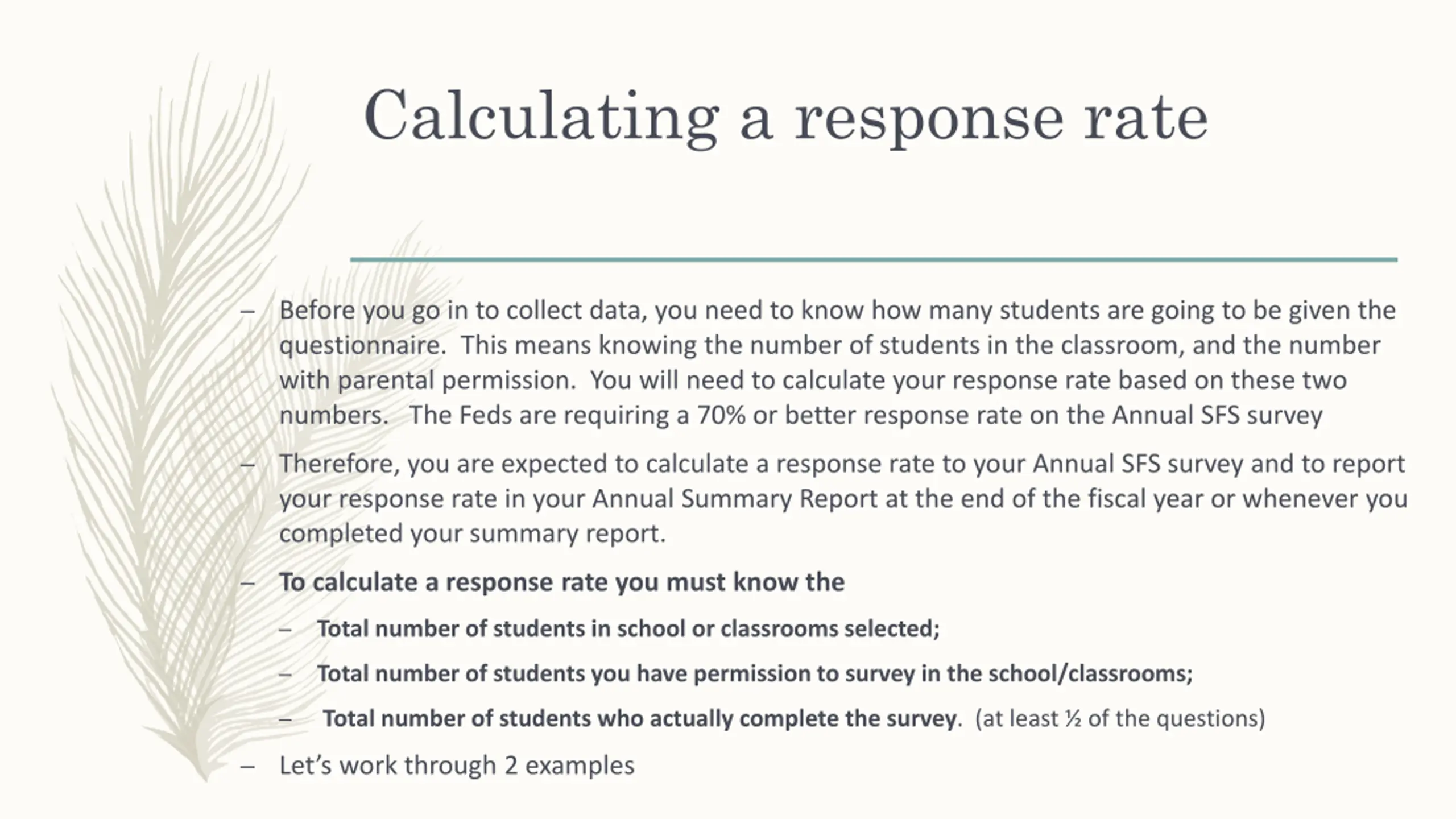 Calculating a response rate Before you go in to collect data, you need to know how many students are going to be given the questionnaire. This means knowing the number of students in the classroom, and the number with parental permission. You will need to calculate your response rate based on these two numbers. The Feds are requiring a 70% or better response rate on the Annual SFS survey Therefore, you are expected to calculate a response rate to your Annual SFS survey and to report your response rate in your Annual Summary Report at the end of the fiscal year or whenever you completed your summary report. To calculate a response rate you must know the Total number of students in school or classrooms selected; Total number of students you have permission to survey in the school/classrooms; Total number of students who actually complete the survey. (at least of the questions) Let s work through 2 examples