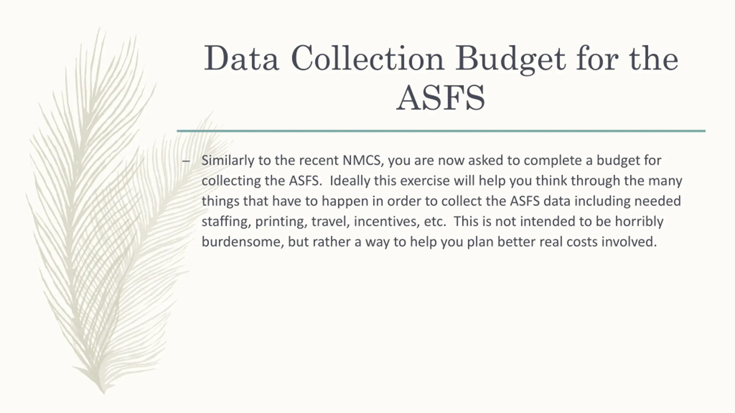 Data Collection Budget for the ASFS Similarly to the recent NMCS, you are now asked to complete a budget for collecting the ASFS. Ideally this exercise will help you think through the many things that have to happen in order to collect the ASFS data including needed staffing, printing, travel, incentives, etc. This is not intended to be horribly burdensome, but rather a way to help you plan better real costs involved.