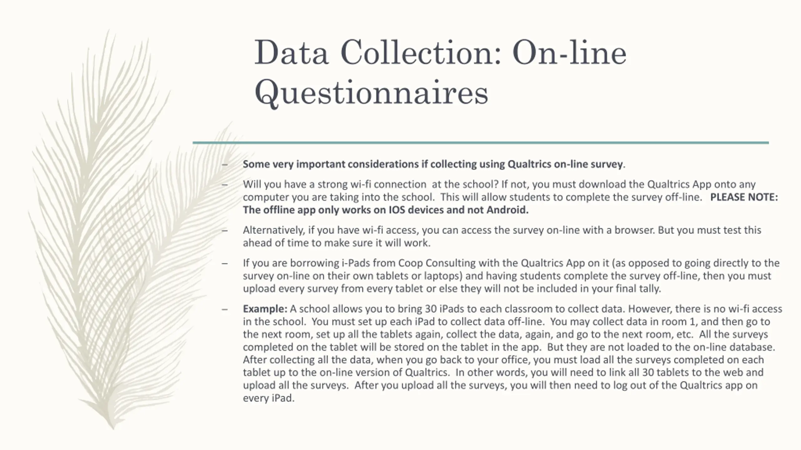 Data Collection: On-line Questionnaires Some very important considerations if collecting using Qualtrics on-line survey. Will you have a strong wi-fi connection at the school? If not, you must download the Qualtrics App onto any computer you are taking into the school. This will allow students to complete the survey off-line. PLEASE NOTE: The offline app only works on IOS devices and not Android. Alternatively, if you have wi-fi access, you can access the survey on-line with a browser. But you must test this ahead of time to make sure it will work. If you are borrowing i-Pads from Coop Consulting with the Qualtrics App on it (as opposed to going directly to the survey on-line on their own tablets or laptops) and having students complete the survey off-line, then you must upload every survey from every tablet or else they will not be included in your final tally. Example: A school allows you to bring 30 iPads to each classroom to collect data. However, there is no wi-fi access in the school. You must set up each iPad to collect data off-line. You may collect data in room 1, and then go to the next room, set up all the tablets again, collect the data, again, and go to the next room, etc. All the surveys completed on the tablet will be stored on the tablet in the app. But they are not loaded to the on-line database. After collecting all the data, when you go back to your office, you must load all the surveys completed on each tablet up to the on-line version of Qualtrics. In other words, you will need to link all 30 tablets to the web and upload all the surveys. After you upload all the surveys, you will then need to log out of the Qualtrics app on every iPad.