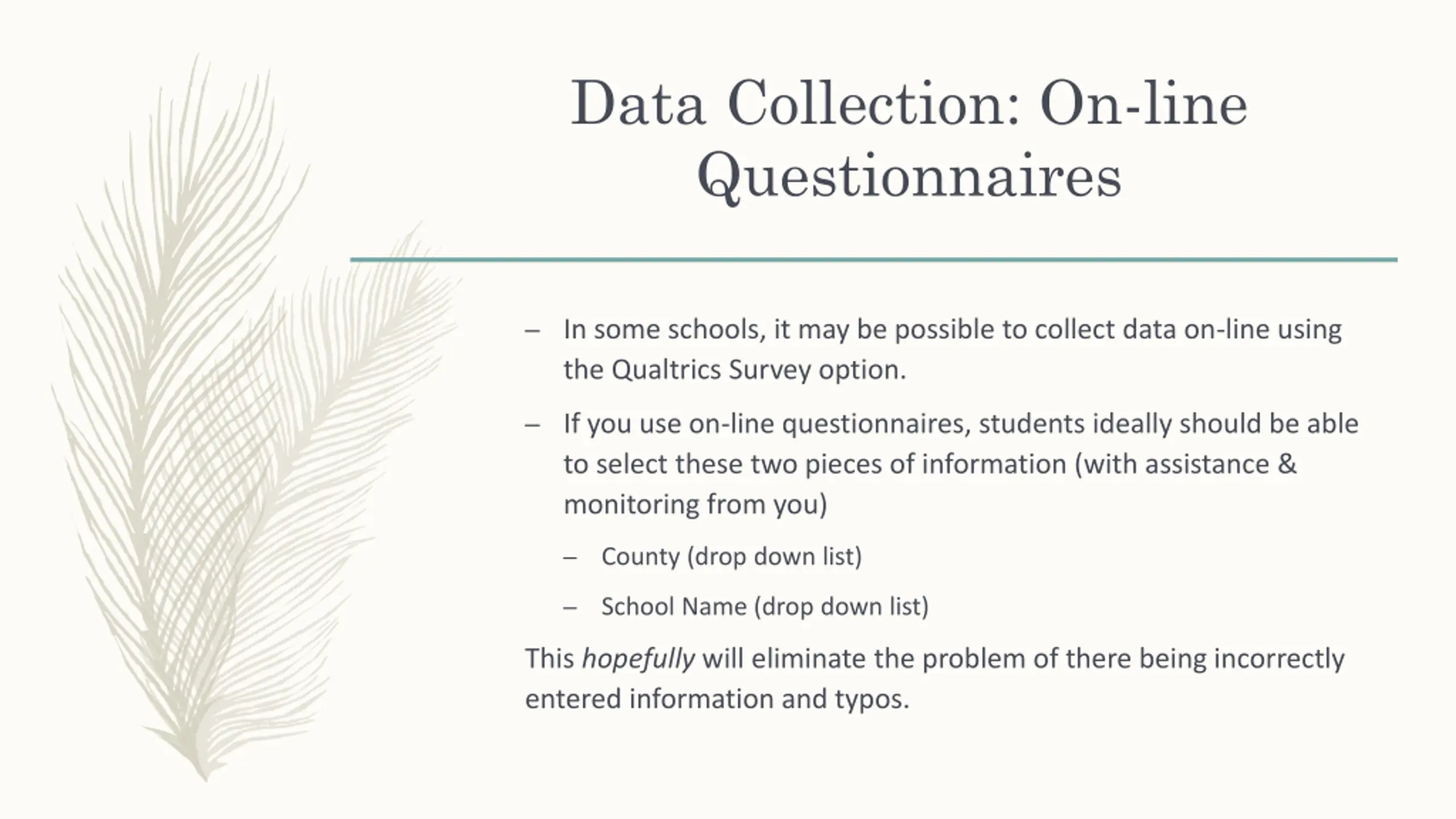 Data Collection: On-line Questionnaires In some schools, it may be possible to collect data on-line using the Qualtrics Survey option. If you use on-line questionnaires, students ideally should be able to select these two pieces of information (with assistance & monitoring from you) County (drop down list) School Name (drop down list) This hopefully will eliminate the problem of there being incorrectly entered information and typos.