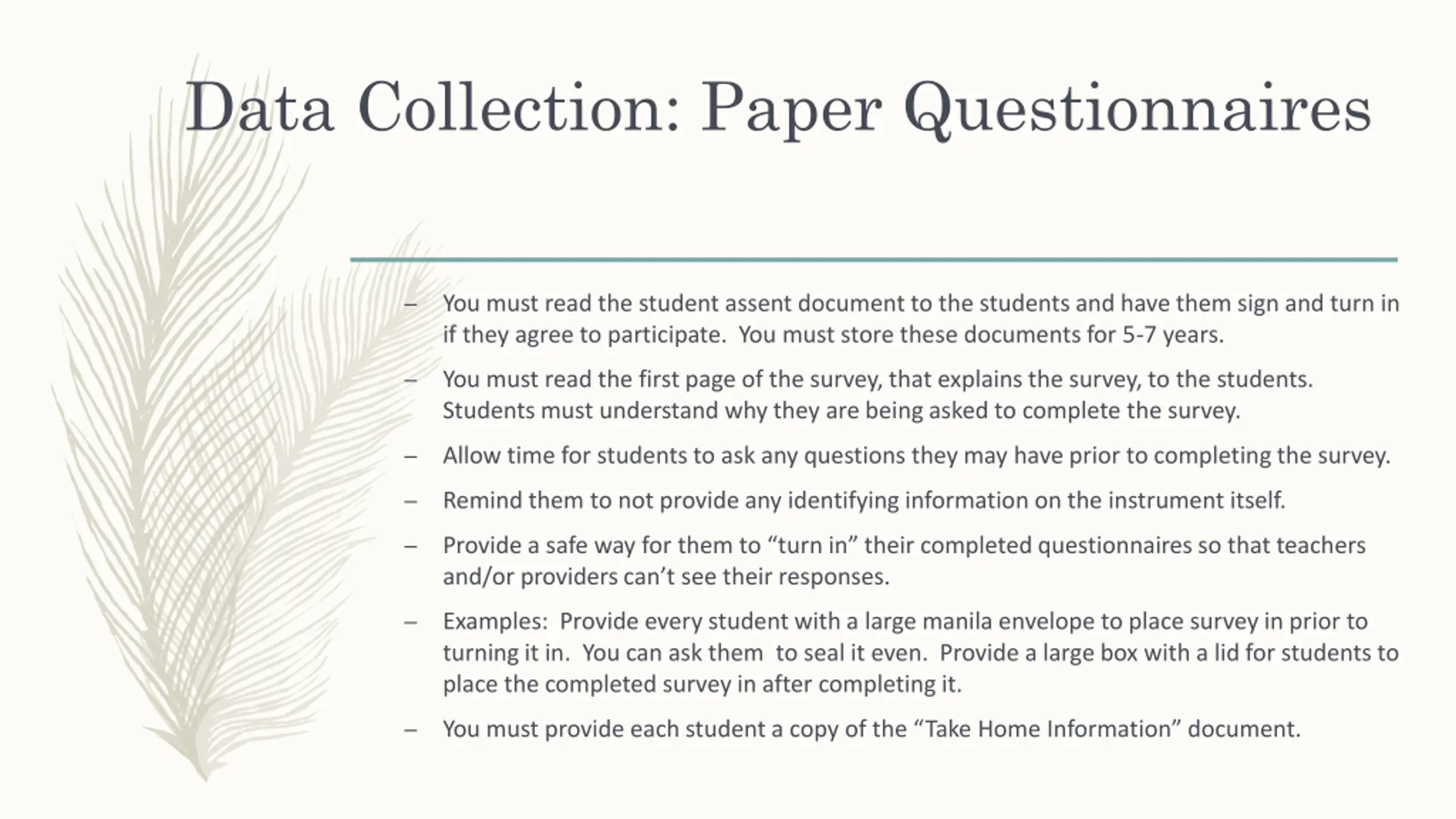 Data Collection: Paper Questionnaires You must read the student assent document to the students and have them sign and turn in if they agree to participate. You must store these documents for 5-7 years. You must read the first page of the survey, that explains the survey, to the students. Students must understand why they are being asked to complete the survey. Allow time for students to ask any questions they may have prior to completing the survey. Remind them to not provide any identifying information on the instrument itself. Provide a safe way for them to turn in their completed questionnaires so that teachers and/or providers can t see their responses. Examples: Provide every student with a large manila envelope to place survey in prior to turning it in. You can ask them to seal it even. Provide a large box with a lid for students to place the completed survey in after completing it. You must provide each student a copy of the Take Home Information document.