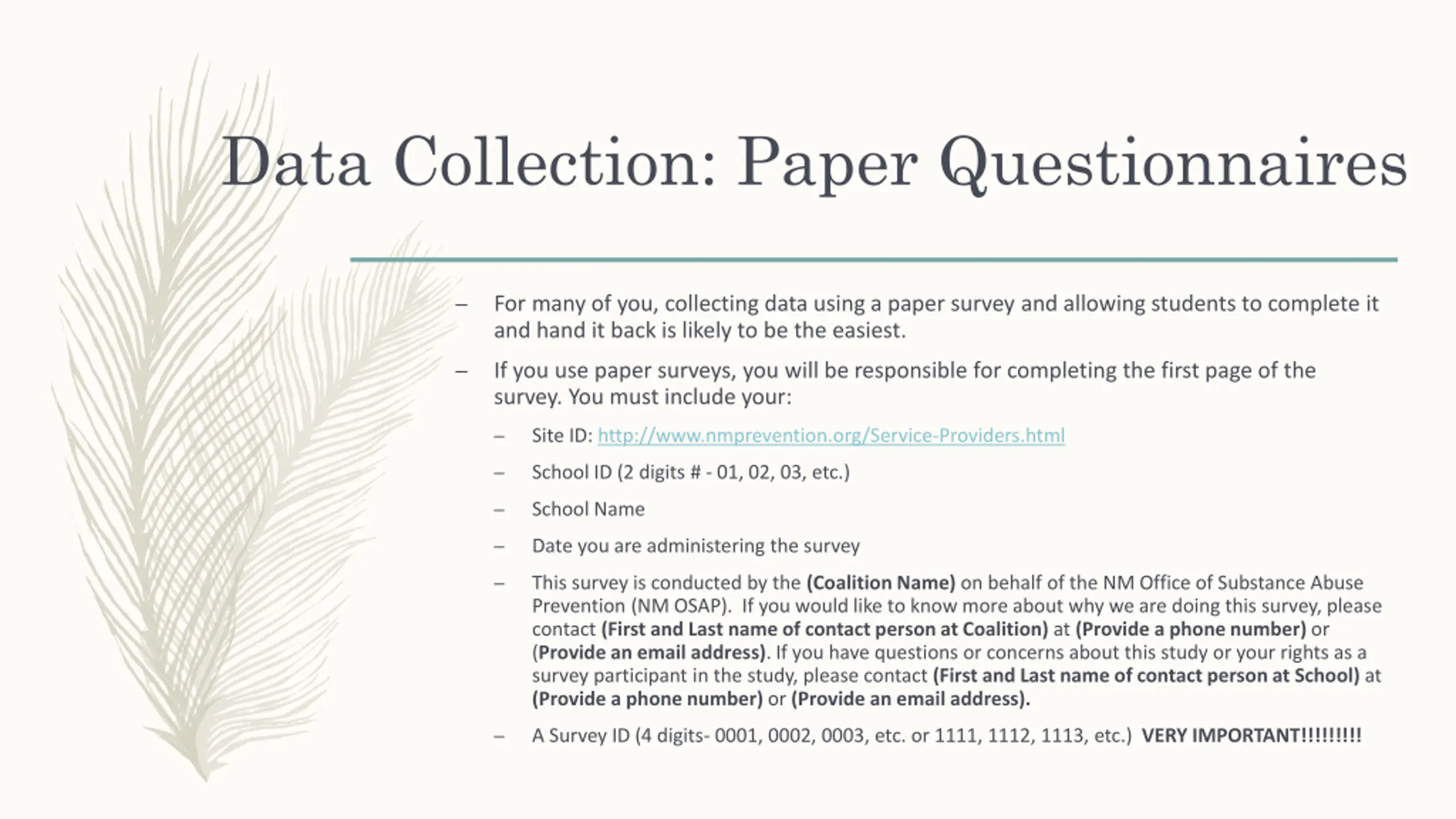 Data Collection: Paper Questionnaires For many of you, collecting data using a paper survey and allowing students to complete it and hand it back is likely to be the easiest. If you use paper surveys, you will be responsible for completing the first page of the survey. You must include your: Site ID: http://www.nmprevention.org/Service-Providers.html School ID (2 digits # - 01, 02, 03, etc.) School Name Date you are administering the survey This survey is conducted by the (Coalition Name) on behalf of the NM Office of Substance Abuse Prevention (NM OSAP). If you would like to know more about why we are doing this survey, please contact (First and Last name of contact person at Coalition) at (Provide a phone number) or (Provide an email address). If you have questions or concerns about this study or your rights as a survey participant in the study, please contact (First and Last name of contact person at School) at (Provide a phone number) or (Provide an email address). A Survey ID (4 digits- 0001, 0002, 0003, etc. or 1111, 1112, 1113, etc.) VERY IMPORTANT!!!!!!!!!