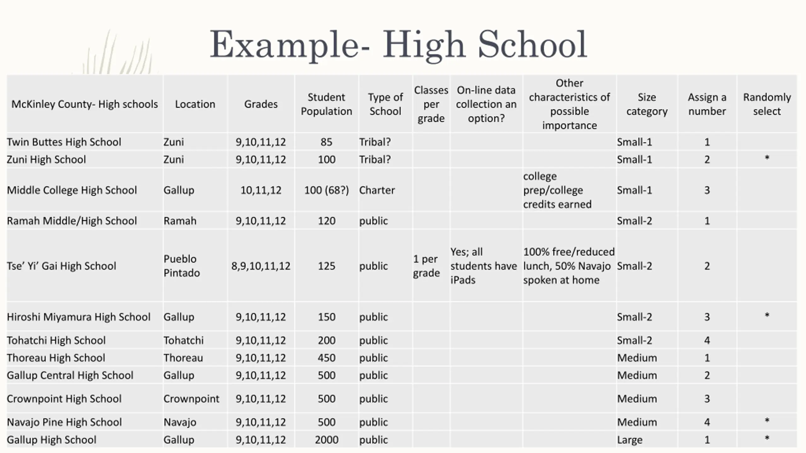 Example- High School Other Classes per grade On-line data collection an option? Student Population Type of School characteristics of possible importance Size Assign a number Randomly select McKinley County- High schools Location Grades category Twin Buttes High School Zuni High School Zuni Zuni 9,10,11,12 9,10,11,12 85 100 Tribal? Tribal? Small-1 Small-1 1 2 * college prep/college credits earned Middle College High School Gallup 10,11,12 100 (68?) Charter Small-1 3 Ramah Middle/High School Ramah 9,10,11,12 120 public Small-2 1 Yes; all students have iPads 100% free/reduced lunch, 50% Navajo spoken at home Pueblo Pintado 1 per grade Tse Yi Gai High School 8,9,10,11,12 125 public Small-2 2 Hiroshi Miyamura High School Gallup 9,10,11,12 150 public Small-2 3 * Tohatchi High School Thoreau High School Gallup Central High School Tohatchi Thoreau Gallup 9,10,11,12 9,10,11,12 9,10,11,12 200 450 500 public public public Small-2 Medium Medium 4 1 2 Crownpoint High School Crownpoint 9,10,11,12 500 public Medium 3 Navajo Pine High School Gallup High School Navajo Gallup 9,10,11,12 9,10,11,12 500 2000 public public Medium Large 4 1 * *